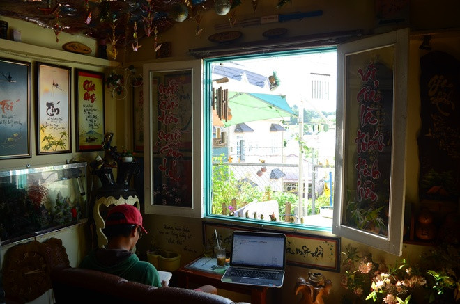 Trong quán có một góc ngồi trước ô cửa sổ được nhiều người ưa thích. Từ đây phóng tầm mắt ra bên ngoài sẽ là khoảng trời rộng thoáng với những dãy nhà lồng liên tiếp hay ngọn núi hùng vĩ.