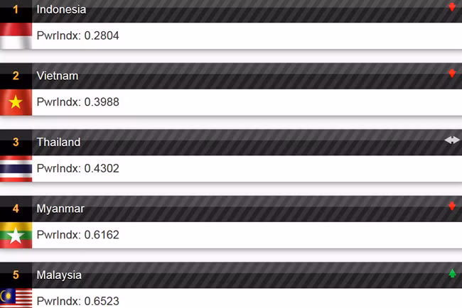 Cụ thể, chỉ số sức mạnh quân sự (PI) của Việt Nam là 0,3988, của Indonesia là 0,2804, của Thái Lan (đứng ngay sau Việt Nam) là 0,4302 (PI càng bé thì sức mạnh quân sự càng lớn).