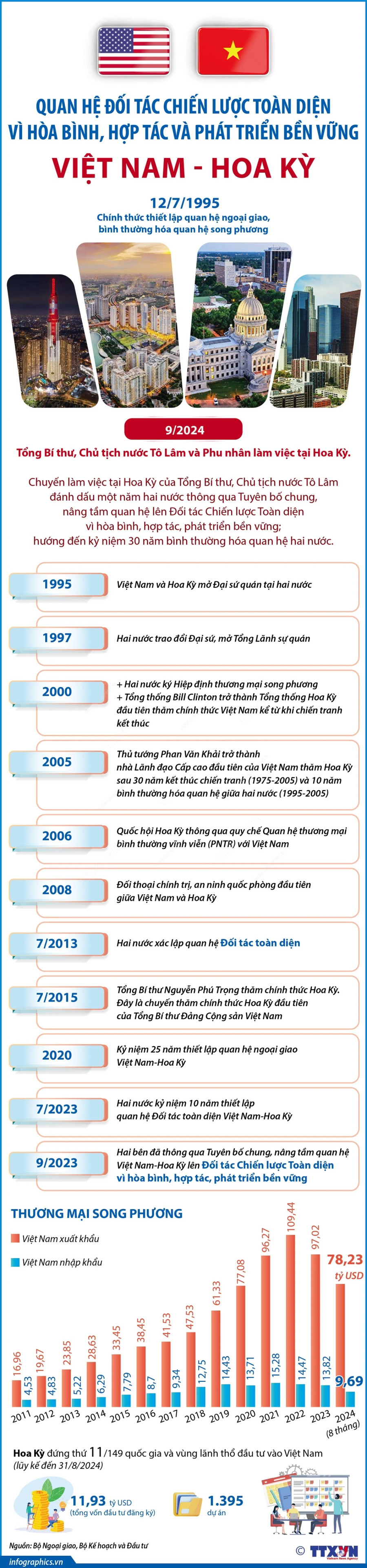 Chuyến làm việc tại Hoa Kỳ của Tổng Bí thư, Chủ tịch nước Tô Lâm đánh dấu một năm hai nước thông qua Tuyên bố chung, nâng tầm quan hệ lên Đối tác Chiến lược Toàn diện vì hòa bình, hợp tác, phát triển bền vững; hướng đến kỷ niệm 30 năm bình thường hóa quan hệ hai nước.