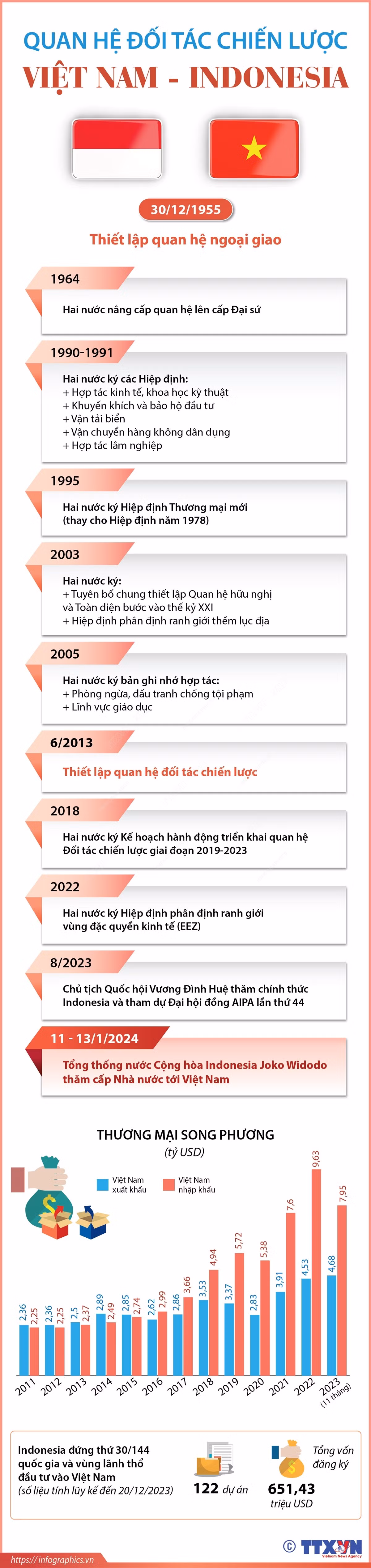 Kể từ khi thiết lập quan hệ ngoại giao (30/12/1955) đến nay, quan hệ Việt Nam - Indonesia phát triển thuận lợi và tích cực. Hai bên thường xuyên trao đổi đoàn và tiếp xúc cấp cao; duy trì phối hợp lập trường chặt chẽ tại các diễn đàn khu vực và quốc tế, đặc biệt là tại ASEAN, Liên hợp quốc, APEC, Phong trào không liên kết…