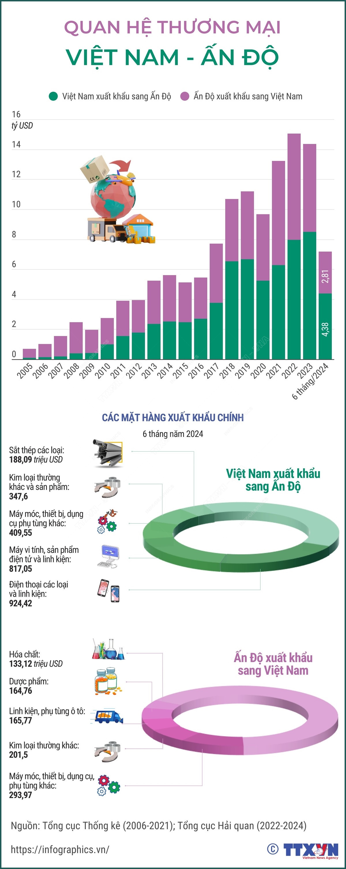 Thương mại song phương giữa Ấn Độ và Việt Nam đã đạt được những thành tựu ấn tượng, tăng từ 200 triệu USD vào năm 2000 lên 14,36 tỷ USD vào năm 2023. Tính riêng 6 tháng đầu năm 2024, tổng kim ngạch xuất nhập khẩu đạt 7,19 tỷ USD, tương đương khoảng 50% của cả năm 2023.