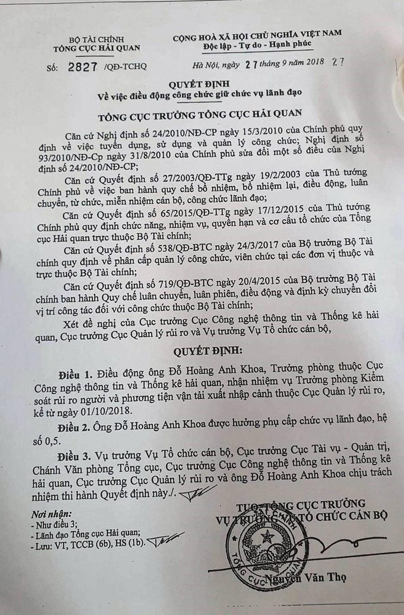 Mới đây, ông Đỗ Hoàng Anh Khoa (con trai Thứ trưởng Bộ Tài chính Đỗ Hoàng Anh Tuấn) đã được bổ nhiệm trở lại vào chức vụ Trưởng phòng Kiểm soát rủi ro người và phương tiện vận tải xuất nhập cảnh (Tổng cục Hải quan).