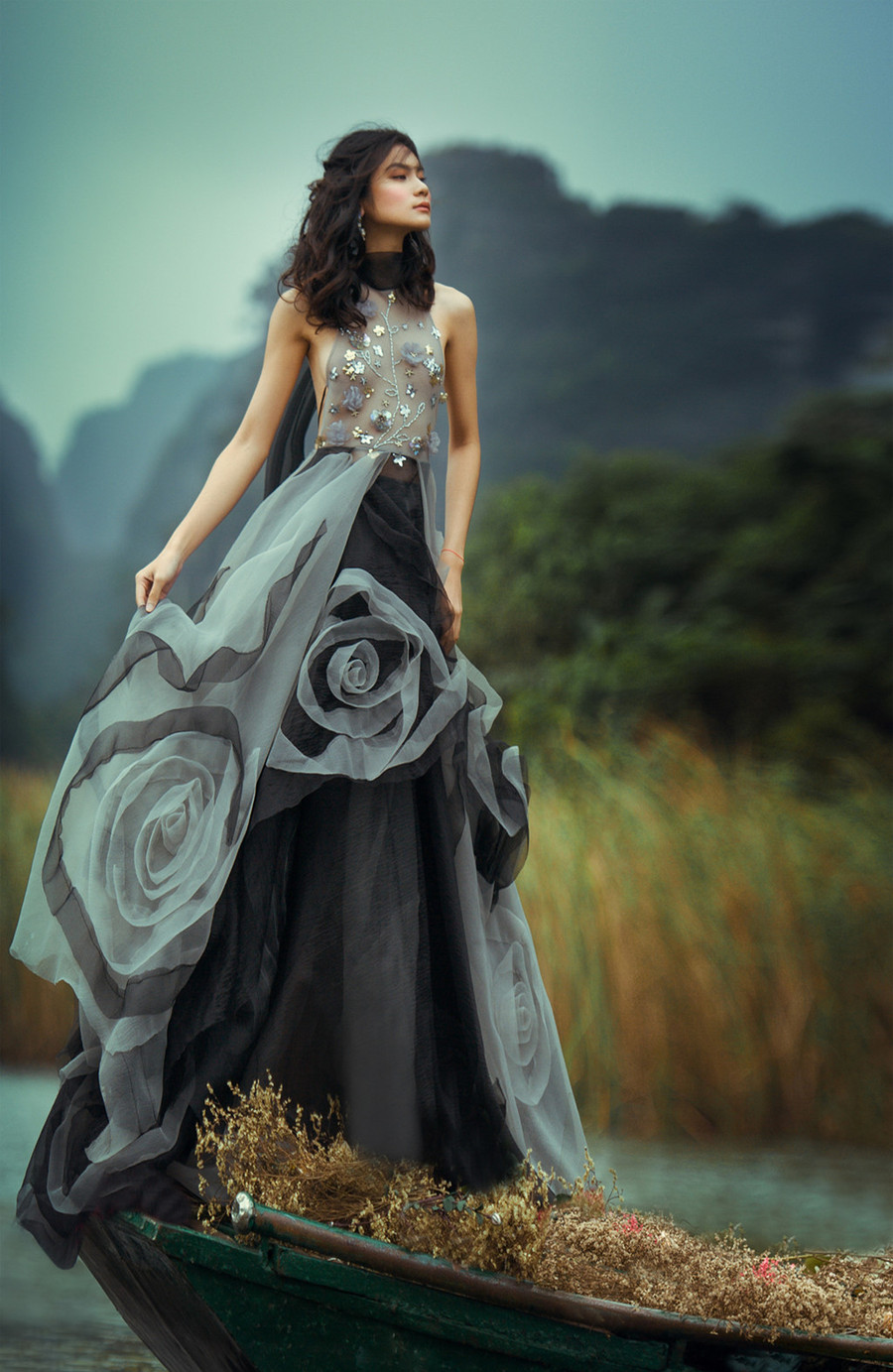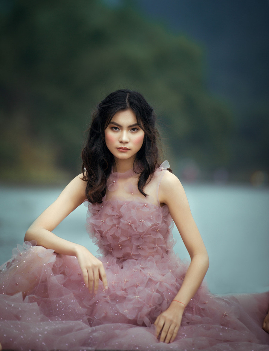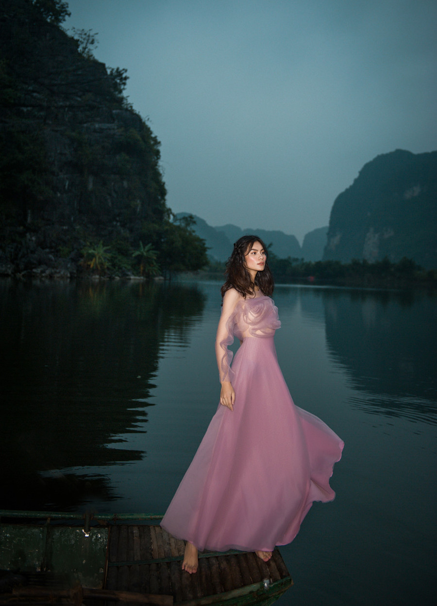 Người mẫu 9X khoe vẻ đẹp mong manh giữa khung cảnh sông nước ở Tràng An (Ninh Bình), khác hẳn một Kim Dung mạnh mẽ, lạnh lùng mà khán giả thường thấy.