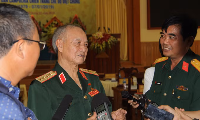 Đại tướng Phạm Văn Trà – Nguyên Bộ trưởng Bộ Quốc phòng, nhân chứng lịch sử chiến tranh bảo vệ biên giới Tây Nam thông tin với phóng viên bên lề hội thảo.