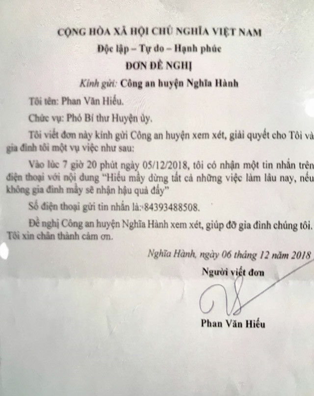 Văn bản mà ông Hiếu gửi cho Công an huyện Nghĩa Hành.