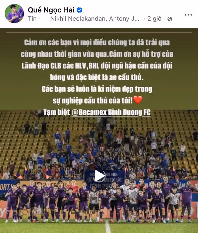Nội dung bài viết, “Hải Quế” gửi lời cảm ơn sâu sắc tới lãnh đạo CLB Bình Dương, ban huấn luyện, đội ngũ hậu cần và toàn thể đồng đội cùng những “kỷ niệm đẹp” của anh trong thời gian khoác áo đội bóng đất Thủ.