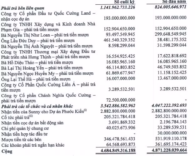 Đáng chú ý, khoản nợ phải trả ngắn hạn khác với các đối tác của QCG lên tới gần 4.685 tỷ đồng. Trong đó các khoản lớn là: 2.882 tỷ đồng nhận tiền trước từ Sunny cho dự án Phước Kiển (do dự án này chưa đủ điều kiện chuyển nhượng); gần 1.300 tỷ đồng tiền mượn của các cá nhân và doanh nghiệp, 205 tỷ đồng tiền nợ cổ tức năm 2017 của cổ đông; còn lại là tiền nhận cọc dự án...