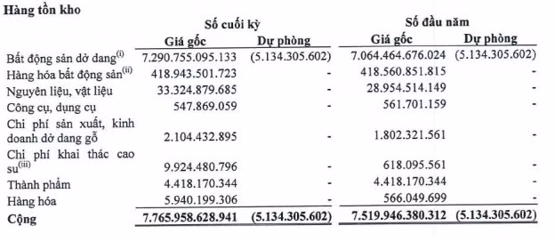Trong đó, bất động sản dở dang (gồm chi phí tiền sử dụng đất, tư vấn thiết kế, xây dựng... liên quan tới các dự án của công ty) là 7.290 tỷ đồng. Còn lại là hàng hóa bất động sản đang chờ bán là 418 tỷ đồng, cùng các nguyên vật liệu khác....