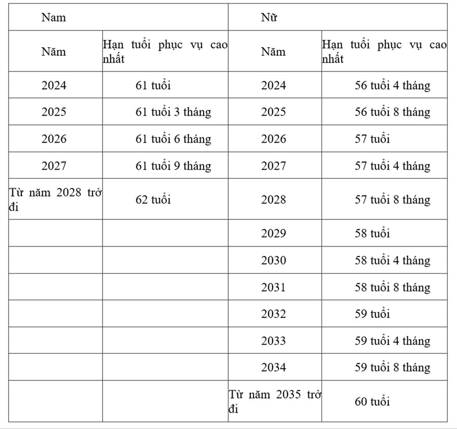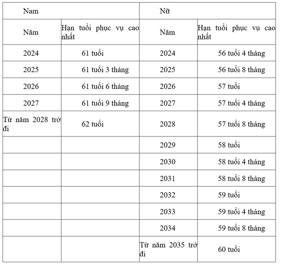 Đối với năm 2024: Hạn tuổi phục vụ cao nhất là 56 tuổi 4 tháng; Đối với năm 2025: Hạn tuổi phục vụ cao nhất là 56 tuổi 8 tháng; Đối với năm 2026: Hạn tuổi phục vụ cao nhất là 57 tuổi; Đối với năm 2027: Hạn tuổi phục vụ cao nhất là 57 tuổi 4 tháng; Đối với năm 2028: Hạn tuổi phục vụ cao nhất là 57 tuổi 8 tháng; Từ năm 2029 trở đi: Hạn tuổi phục vụ cao nhất là 58 tuổi.