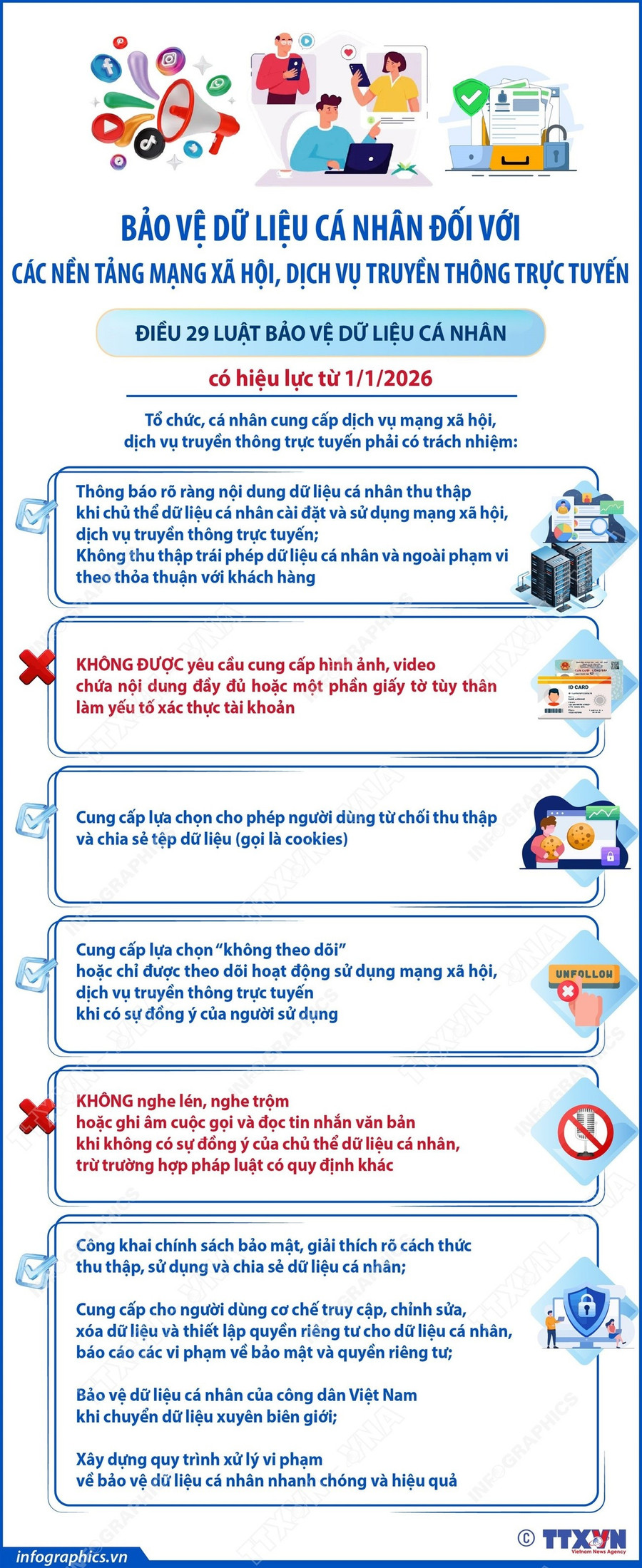 Theo quy định tại Điều 29 Luật Bảo vệ dữ liệu cá nhân, từ 1/1/2026, tổ chức, cá nhân cung cấp dịch vụ mạng xã hội, dịch vụ truyền thông trực tuyến phải có trách nhiệm: Thông báo rõ ràng nội dung dữ liệu cá nhân thu thập khi chủ thể dữ liệu cá nhân cài đặt và sử dụng mạng xã hội, dịch vụ truyền thông trực tuyến; Không thu thập trái phép dữ liệu cá nhân và ngoài phạm vi theo thỏa thuận với khách hàng; Không được yêu cầu cung cấp hình ảnh, video chứa nội dung đầy đủ hoặc một phần giấy tờ tùy thân làm yếu tố xác thực tài khoản; Cung cấp lựa chọn cho phép người dùng từ chối thu thập và chia sẻ tệp dữ liệu (gọi là cookies); Cung cấp lựa chọn “không theo dõi” hoặc chỉ được theo dõi hoạt động sử dụng mạng xã hội, dịch vụ truyền thông trực tuyến khi có sự đồng ý của người sử dụng; Không nghe lén, nghe trộm hoặc ghi âm cuộc gọi và đọc tin nhắn văn bản khi không có sự đồng ý của chủ thể dữ liệu cá nhân, trừ trường hợp pháp luật có quy định khác.../.