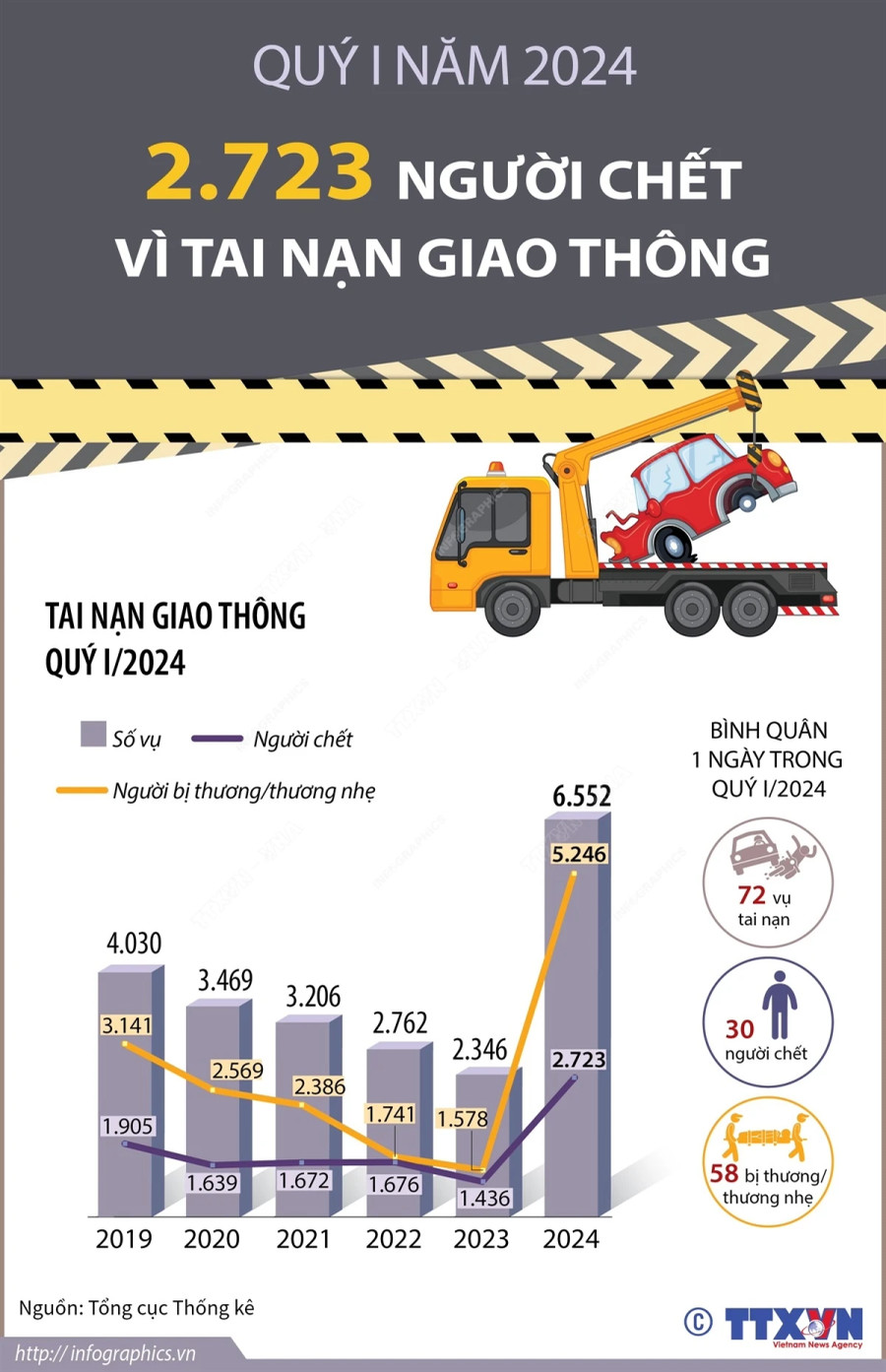 Tính chung quý I-2024, trên địa bàn cả nước xảy ra 6.552 vụ tai nạn giao thông, bao gồm 4.465 vụ tai nạn giao thông từ ít nghiêm trọng trở lên và 2.087 vụ va chạm giao thông, làm 2.723 người chết, 2.924 người bị thương và 2.322 người bị thương nhẹ.