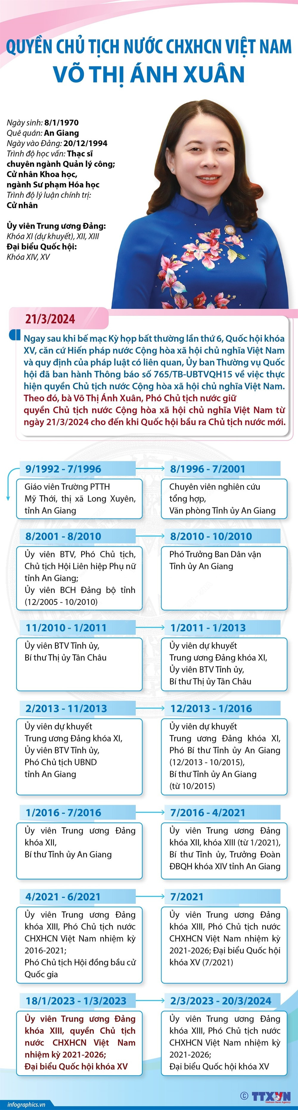 Theo đó, bà Võ Thị Ánh Xuân, Phó Chủ tịch nước giữ quyền Chủ tịch nước Cộng hòa xã hội chủ nghĩa Việt Nam từ ngày 21/3/2024 cho đến khi Quốc hội bầu ra Chủ tịch nước mới.