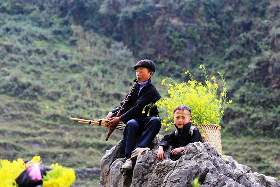 | Ngày cuối tuần, được nghỉ học, lũ trẻ rủ nhau hái từng gùi hoa cải vàng lên núi. Với lũ trẻ, đây vừa là cách để làm thêm giúp bố mẹ và cũng dịp để được đi chơi, được giao tiếp với mọi người. Không xin tiền, không xin quà... chỉ là những gùi cải vàng ruộm và những nụ cười rất tươi nhưng du khách khi dừng chân chụp ảnh đều có chung cảm giác được trở về với tuổi thơ |