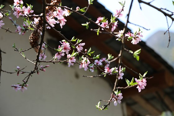 | Giữa ngút ngàn núi đá, một sắc tươi hồng của hoa đào nở muộn cũng làm mềm lòng du khách |