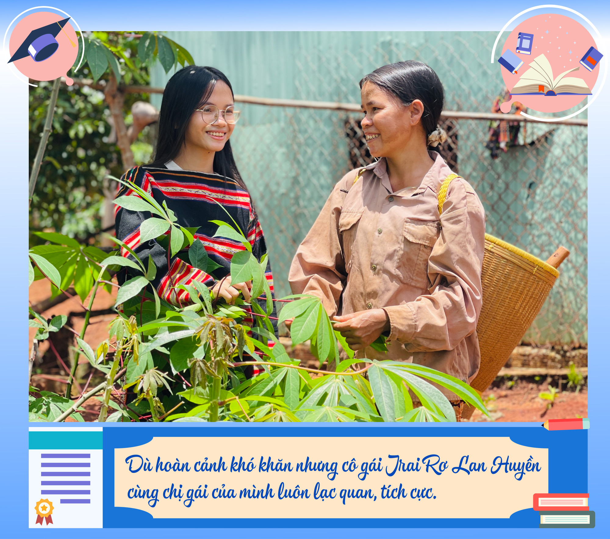 Những ngày nghỉ hè, cô sinh viên Trường Đại học Sư phạm Đà Nẵng Rơ Lan Huyền về làng Sung O-Boòng Nga thăm mẹ và phụ giúp dì việc nương rẫy. Mẹ Huyền mắc bệnh tâm thần đã mười mấy năm rồi. Cô gái nhỏ nhắn ấy đón chúng tôi bằng nụ cười tươi cùng ánh mắt đượm buồn song vẫn ánh lên nét tươi sáng.