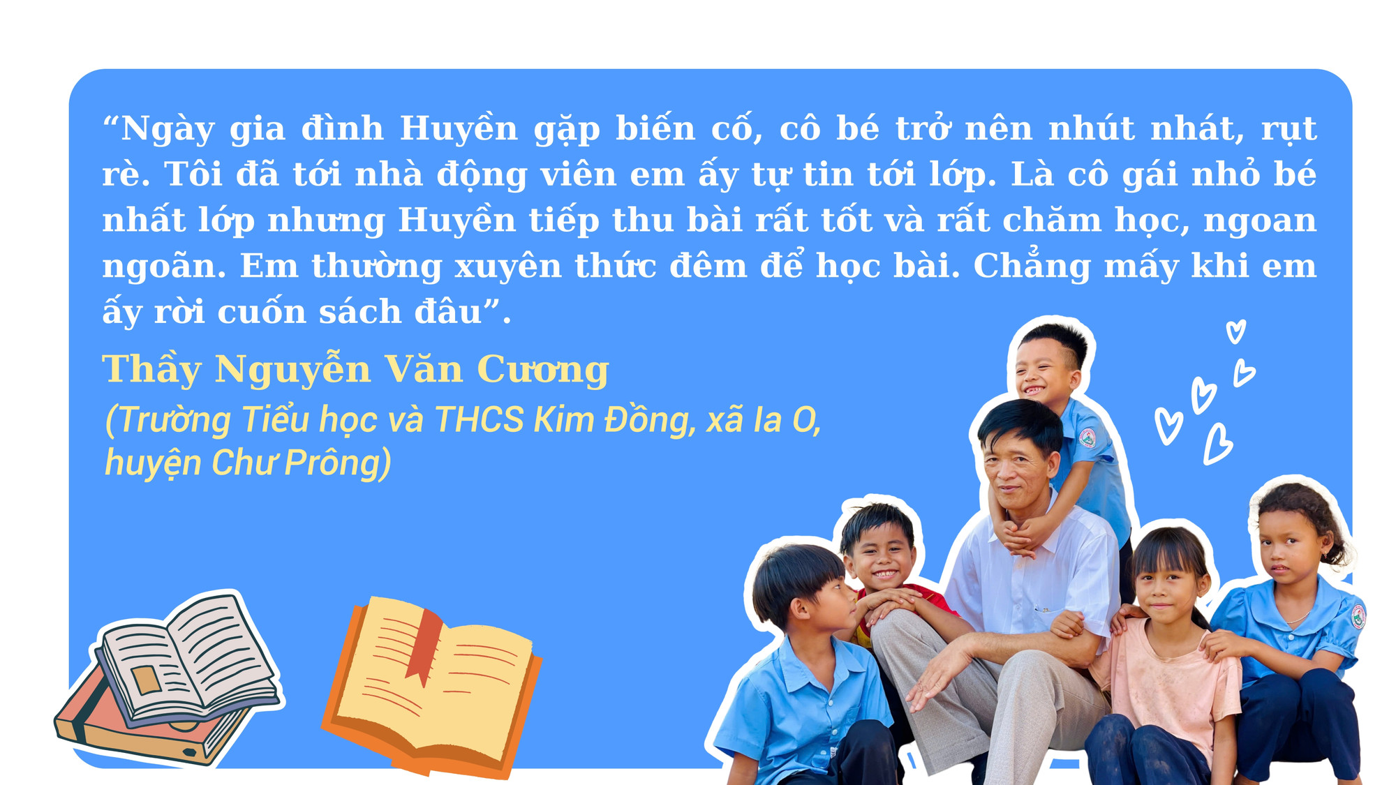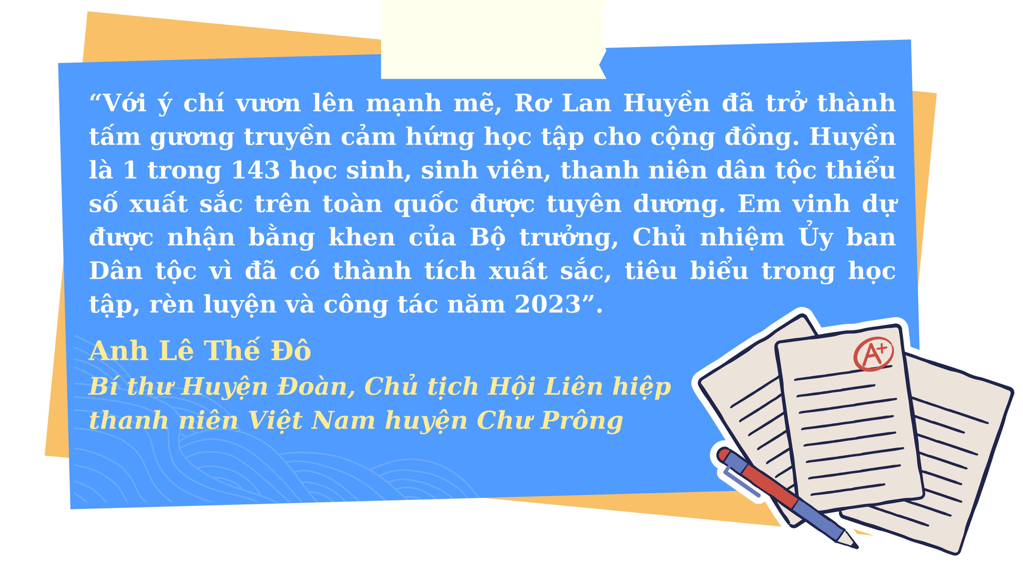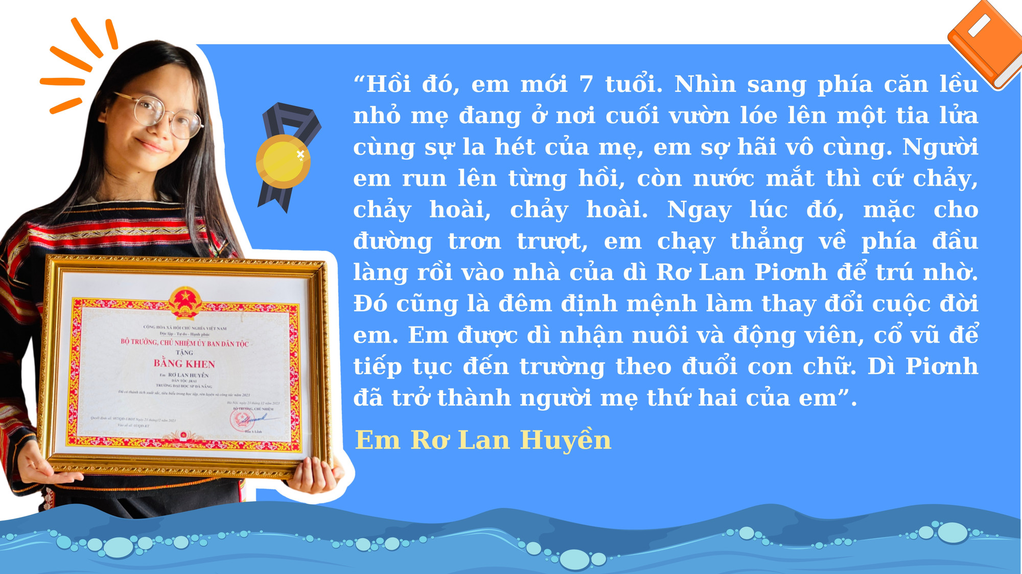 Và niềm tự hào của người thầy năm ấy về cô học trò nhỏ đã được nhân lên theo năm tháng khi thành tích học tập của Huyền ngày càng cao. 3 năm theo học tại Trường Phổ thông Dân tộc nội trú tỉnh, Huyền đều đạt thành tích học sinh giỏi, hạnh kiểm tốt; đạt giải ba môn Địa lý tại kỳ thi học sinh giỏi cấp tỉnh năm học 2022-2023. Năm 2023, Huyền thi đậu Trường Đại học Sư phạm Đà Nẵng, chuyên ngành Giáo dục tiểu học.