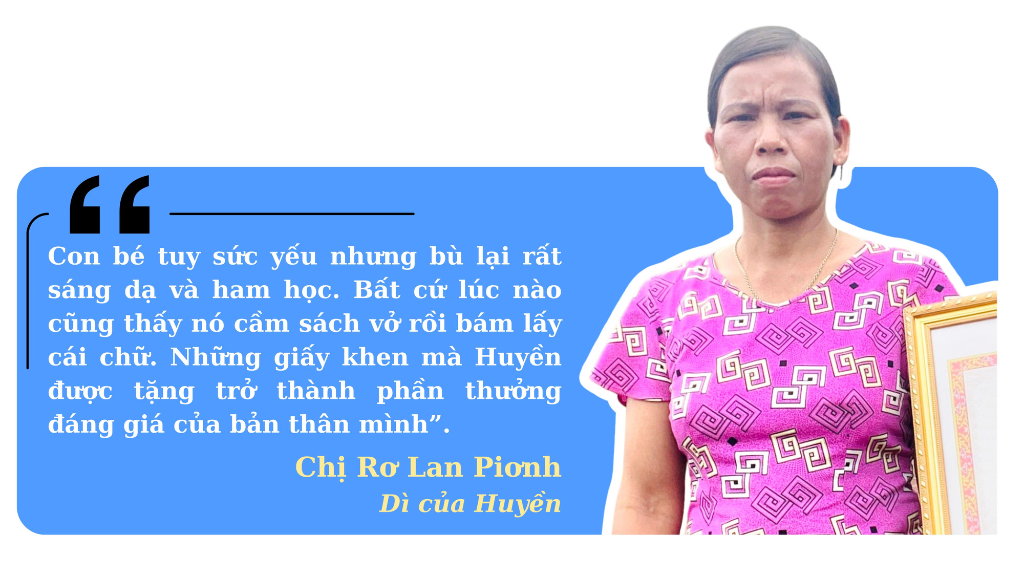 Huyền kể, nhà dì Piơnh nghèo lắm! Dì còn nuôi cậu em trai cũng mắc căn bệnh tâm thần. Thế nhưng, vì thương cô bé sáng dạ ham học mà dì đã nhận Huyền về bảo ban, chăm sóc và tiếp thêm động lực để em vượt qua nghịch cảnh. Chị Piơnh chia sẻ: “Hồi mới bị bệnh, mẹ thường đập phá nên Huyền rất sợ. Mỗi lần đi học về, cháu chỉ đứng nhìn từ xa rồi khóc chứ không dám lại gần. Mình thương cháu nên thay bố mẹ nuôi nấng, chăm sóc. Giờ Huyền như con gái của mình.