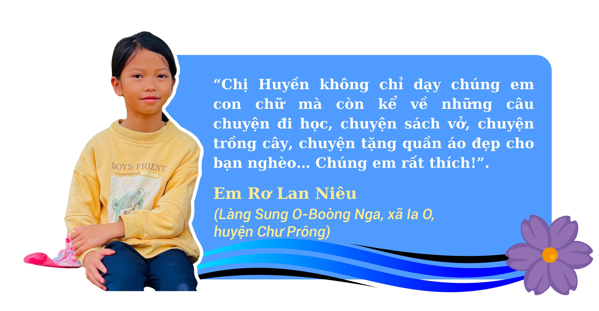 “Có được thành quả này, ngoài sự nỗ lực của bản thân, em còn nhận được rất nhiều sự quan tâm, giúp đỡ của các thầy-cô giáo, sự động viên của gia đình và bạn bè đã tiếp thêm động lực và niềm tin để em vượt qua những khó khăn của cuộc sống. Em sẽ tiếp tục cố gắng để hoàn thành thật tốt việc học và được quay trở về ngôi làng của mình dạy con chữ cho lũ trẻ. Em mong mình có thể góp sức để không còn đứa trẻ Jrai khó khăn nào không được tới trường”-Huyền bày tỏ nguyện vọng.