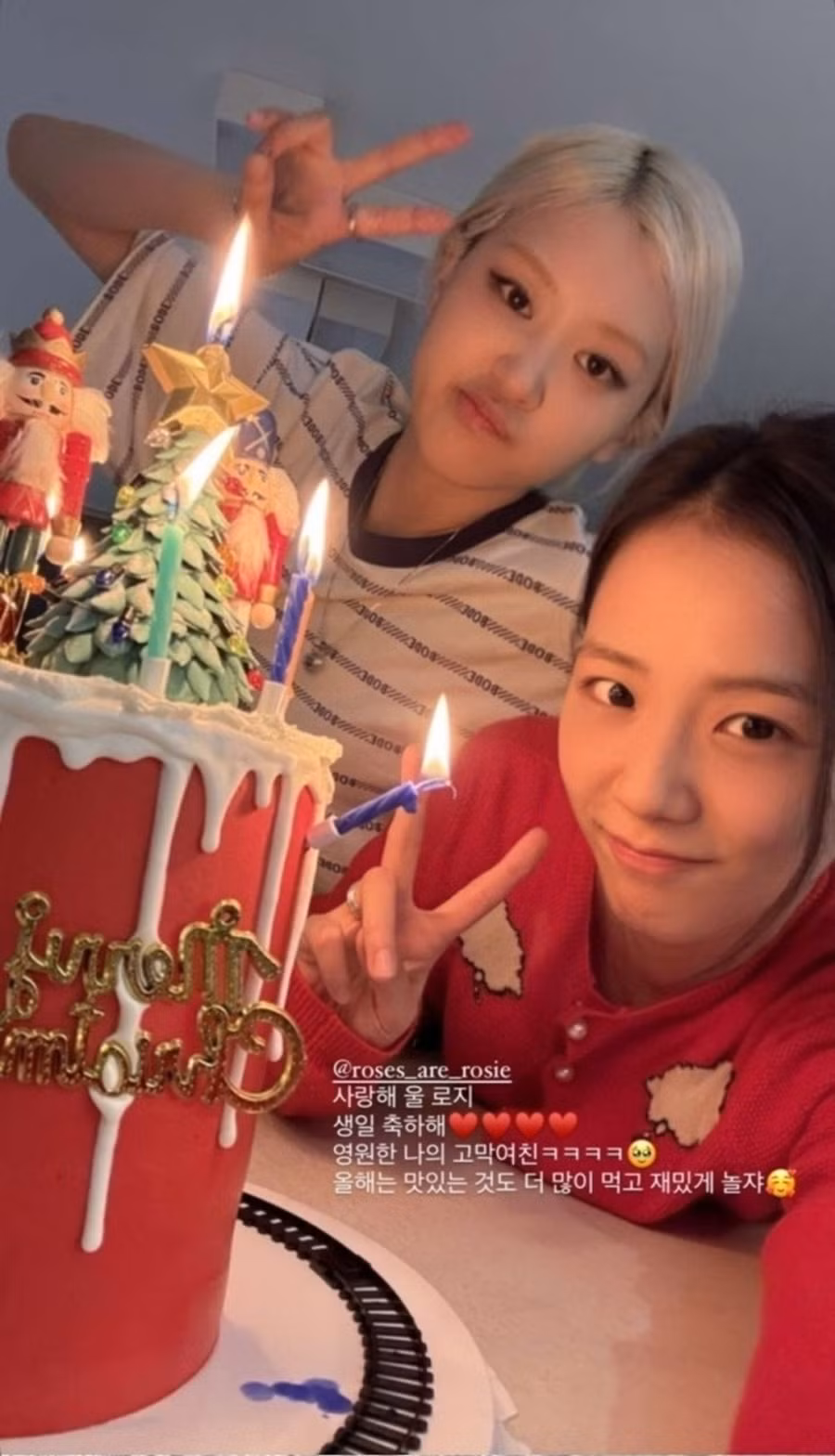 Sau đó, Jisoo chia sẻ ảnh chụp cùng người em thân thiết, kèm dòng nhắn nhủ trên Instagram Story: “Yêu em, Rosé thân yêu của chị. Chúc mừng sinh nhật, người bạn mãi mãi ngọt ngào của chị. Hãy ăn thật nhiều đồ ăn ngon và vui vẻ trong năm nay nhé!".