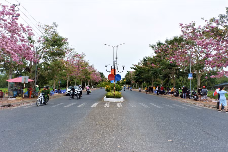 Đường Hùng Vương dẫn vào trung tâm hành chính huyện có hơn 160 cây hoa kèn hồng đang là điểm tham quan, chụp ảnh lý tưởng của du khách.