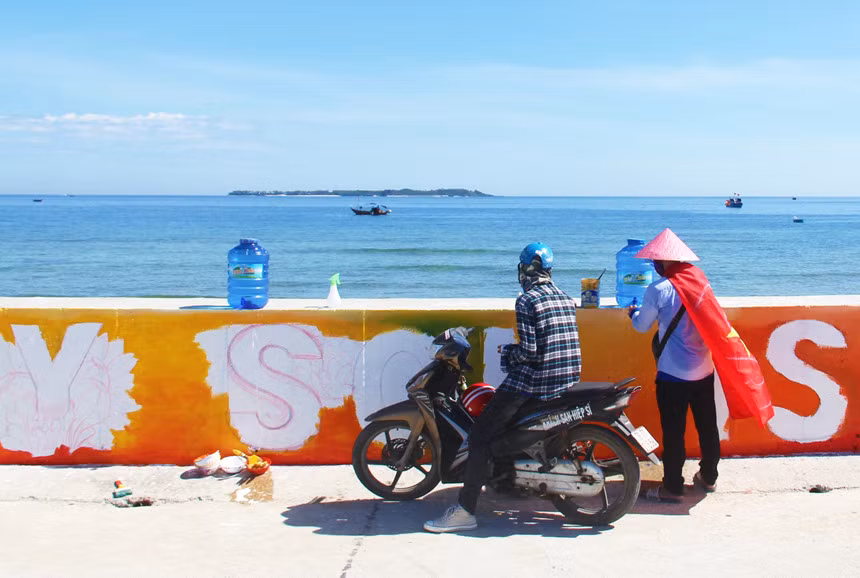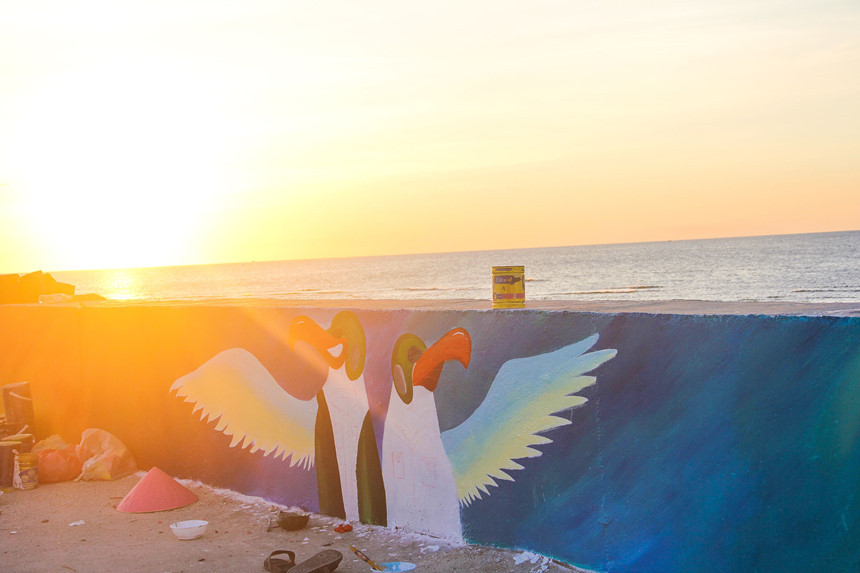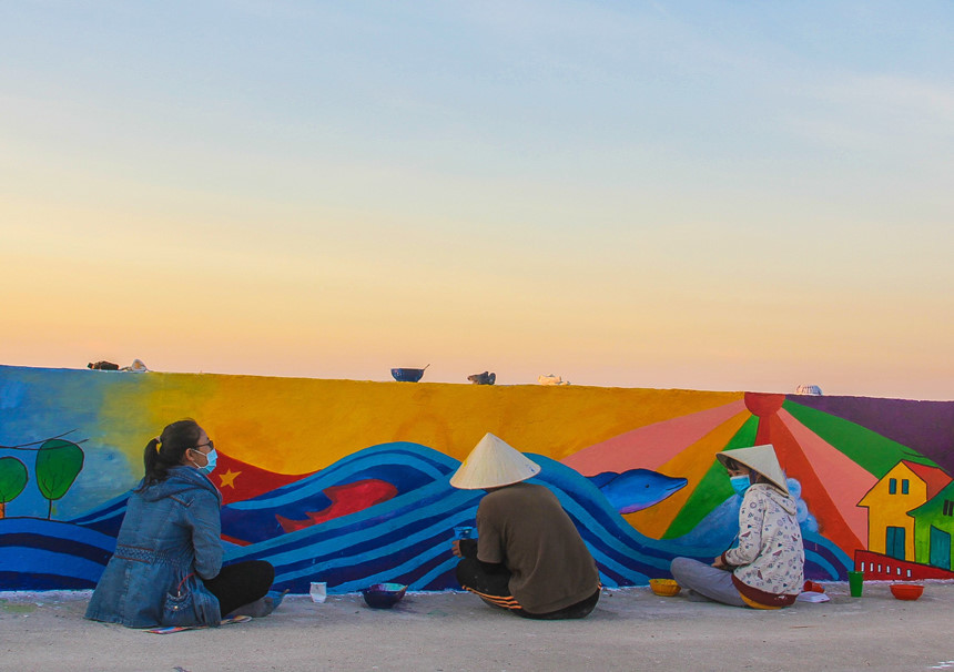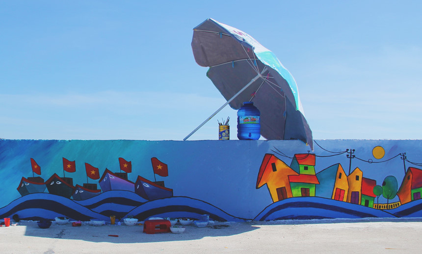 "Thông thường, một ngày của chúng mình sẽ bắt đầu từ lúc 4-8h. Sau đó, cả nhóm trở về phòng và chuẩn bị cho công việc buổi chiều, bắt đầu vào khoảng 16h đổ ra", Úy cho biết. Tôi gặp Úy vào gần 9h, khi phần lớn mọi người đã về hết, chỉ còn lại vài bạn đang thu dọn nốt đồ đạc. Cái nắng biển khô rạc người, cháy rát trên da thịt quả thật không dễ chịu. Ngồi trên con đường bê tông để tô vẽ trong những ngày cao điểm nóng của cả nước quả thật chẳng phải dễ dàng gì.