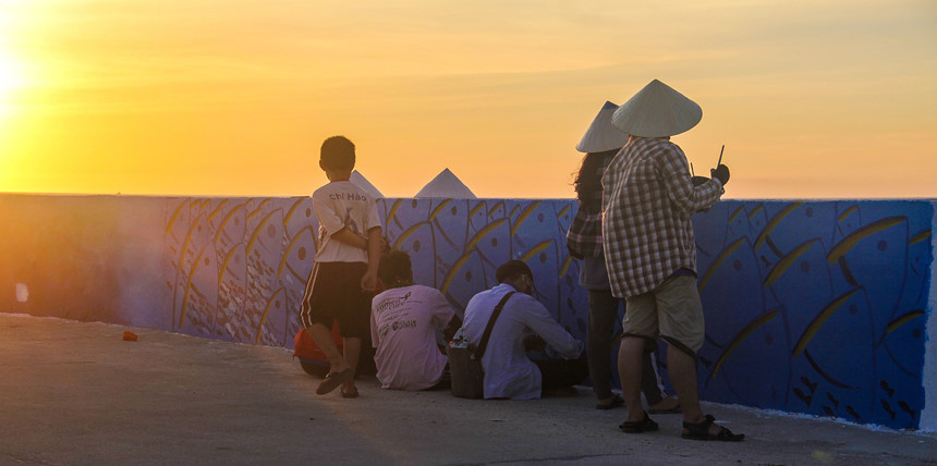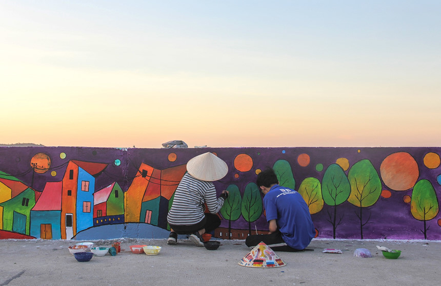 Dưới cái nắng gay gắt của mùa hè, những sinh viên chủ yếu đến từ khoa kiến trúc, Đại học Đách Khoa - Đại học Đà Nẵng đang cặm cụi tô vẽ, tạo nên con đường nghệ thuật đầu tiên cho hòn đảo Lý Sơn. Được biết, đây là công trình thanh niên tuổi trẻ thành phố Đà Nẵng do đoàn trường phát động với hy vọng sẽ tạo thêm điểm nhấn cho hòn đảo Lý Sơn để thu hút khách du lịch.