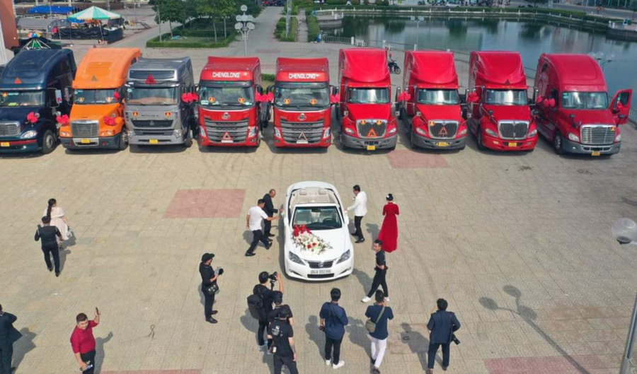 Theo như quan sát, vị trí hàng đầu là ô tô màu trắng tinh khôi bên trong chở cặp đôi cô dâu, chú rể cười tươi và nối đuôi theo là 12 đầu kéo xe container được trang trí nơ đỏ, cùng nhau di chuyển một đường thẳng trên đường khiến nhiều người không khỏi tò mò và thích thú.