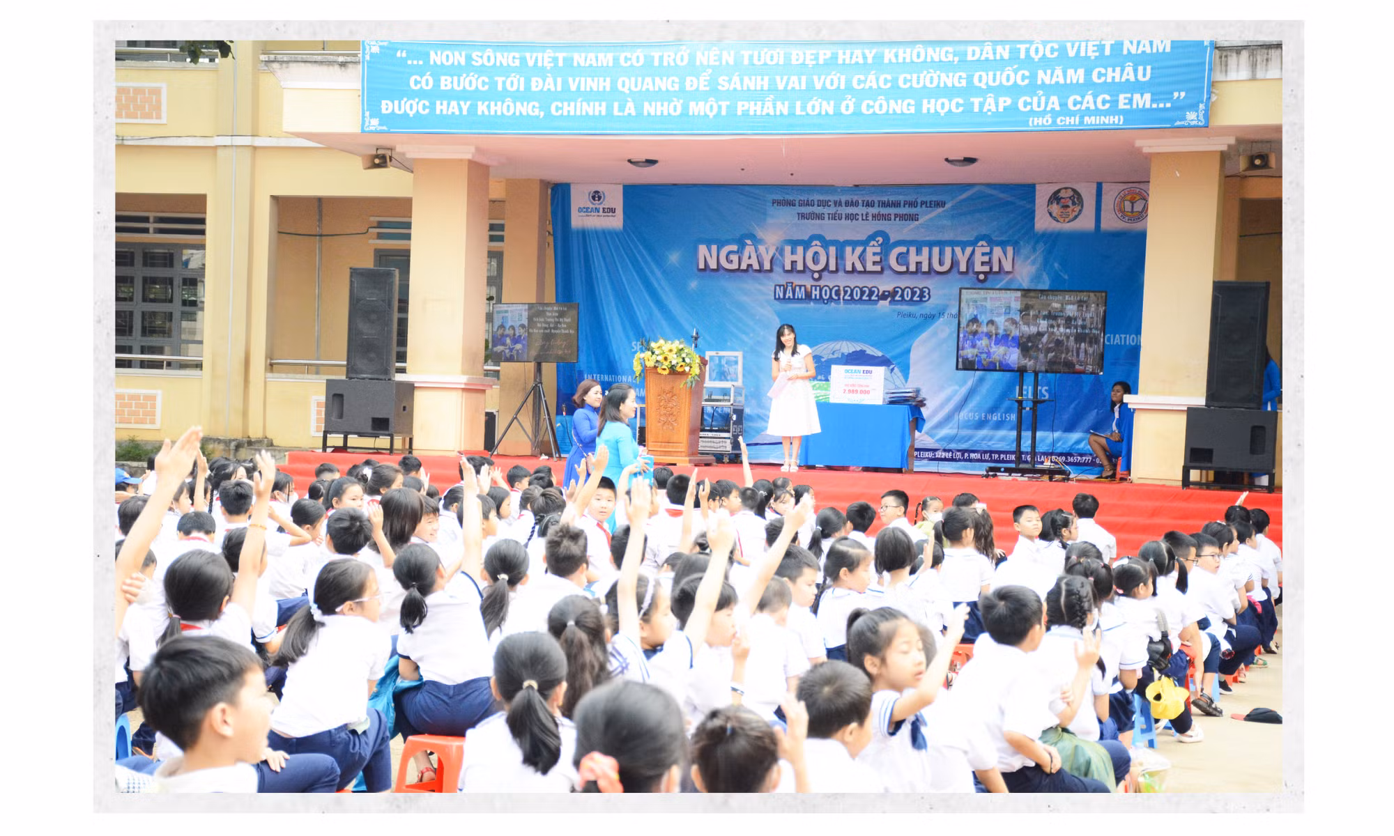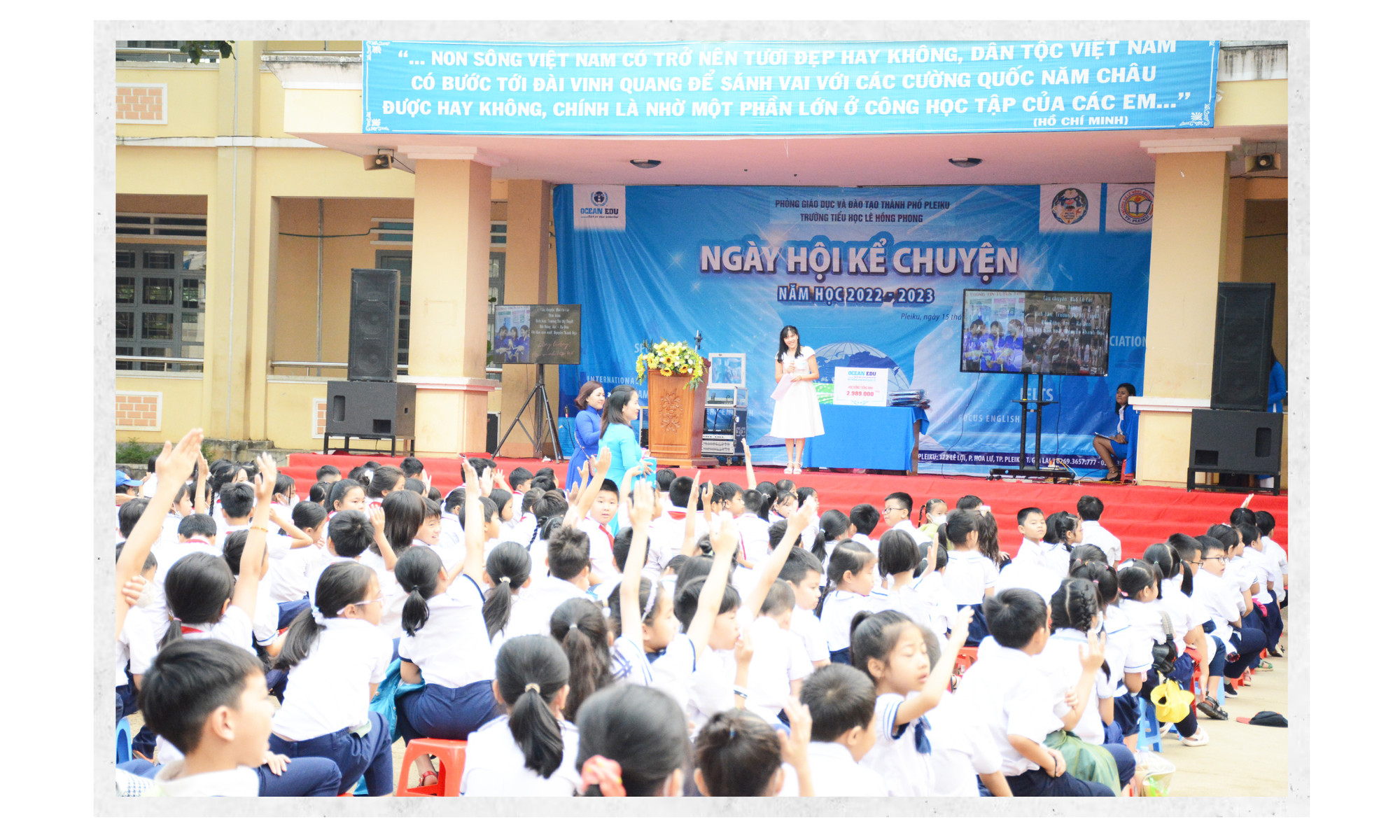Sáng 15-4, hàng trăm học sinh Trường Tiểu học Lê Hồng Phong (TP. Pleiku) háo hức tập trung về sân trường để tham gia “Ngày hội kể chuyện” do điều phối viên của chương trình “Liên hoan kể chuyện cho trẻ em năm 2023” phối hợp với nhà trường tổ chức. Đây là dự án do Cộng đồng Giáo dục Reggio Emilia tại Việt Nam (VIRES) điều phối, tổ chức tại 19 tỉnh, thành trong cả nước nhằm nhấn mạnh ý nghĩa gắn kết của những không gian kể chuyện, phát huy trí tưởng tượng và tiềm năng của trẻ em, góp phần lan tỏa văn hóa đọc.