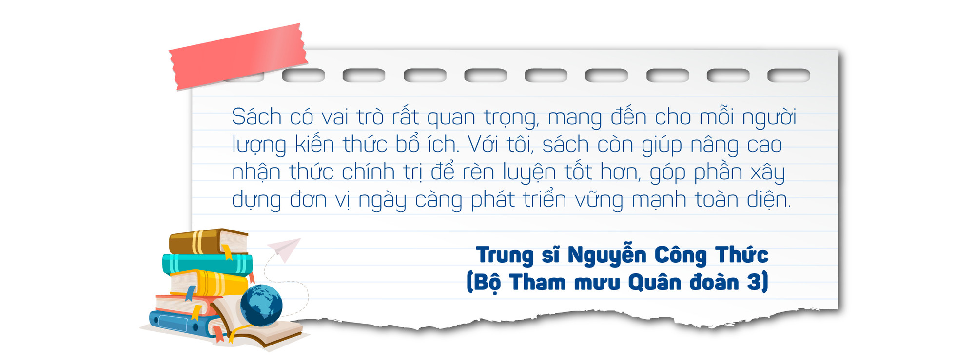 Đơn cử, nhân Ngày Sách và Văn hóa đọc Việt Nam năm 2023, Bộ Tham mưu Quân đoàn 3 đã có hướng dẫn tổ chức rất chi tiết với yêu cầu đưa ứng dụng công nghệ thông tin, chuyển đổi số để tạo ra giá trị mới; tổ chức câu lạc bộ về sách, phát huy công năng của các tủ sách pháp luật ở đại đội, hướng dẫn kỹ năng đọc sách. Cùng với đó, tổ chức cuộc thi đại sứ văn hóa đọc, tọa đàm, thi kể chuyện, sân khấu hóa, làm theo sách, tuyên truyền giới thiệu sách; phối hợp với địa phương nơi đóng quân tổ chức các hoạt động triển lãm, hội sách; treo pa nô, băng rôn, khẩu hiệu về sách và tuyên truyền trên hệ thống truyền thanh nội bộ của đơn vị, tạo không khí sôi nổi và có ý nghĩa lan tỏa cao.