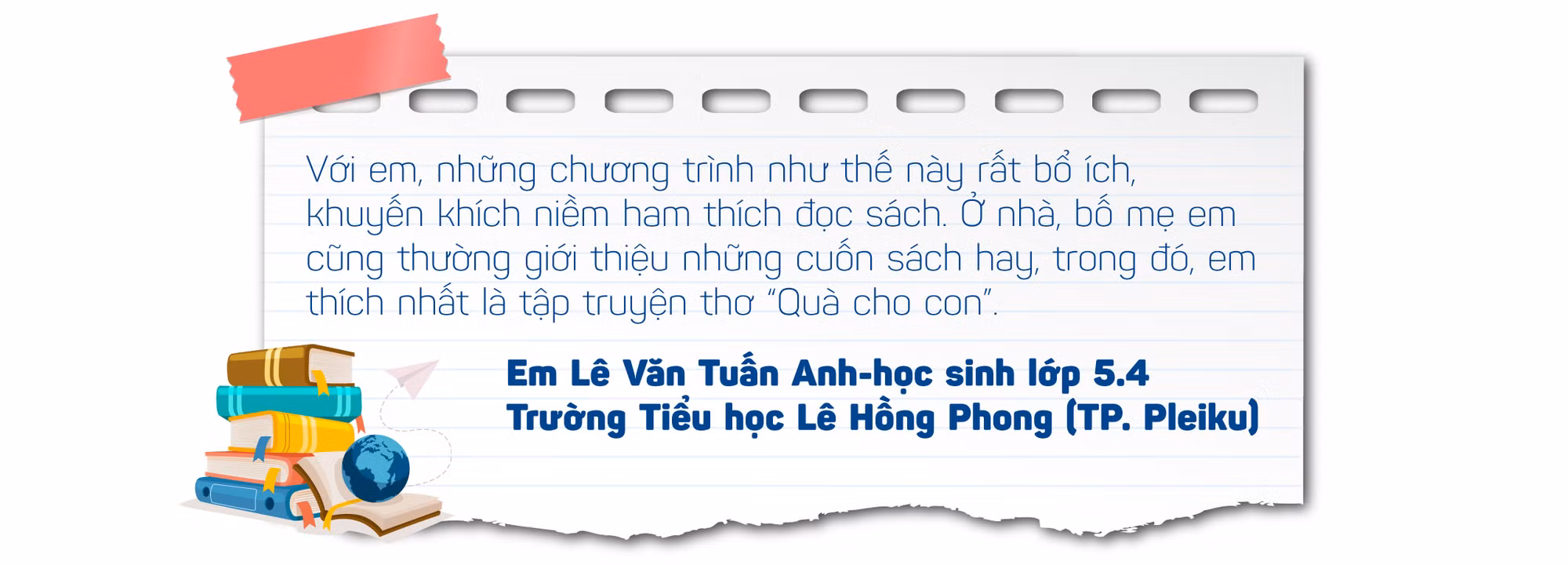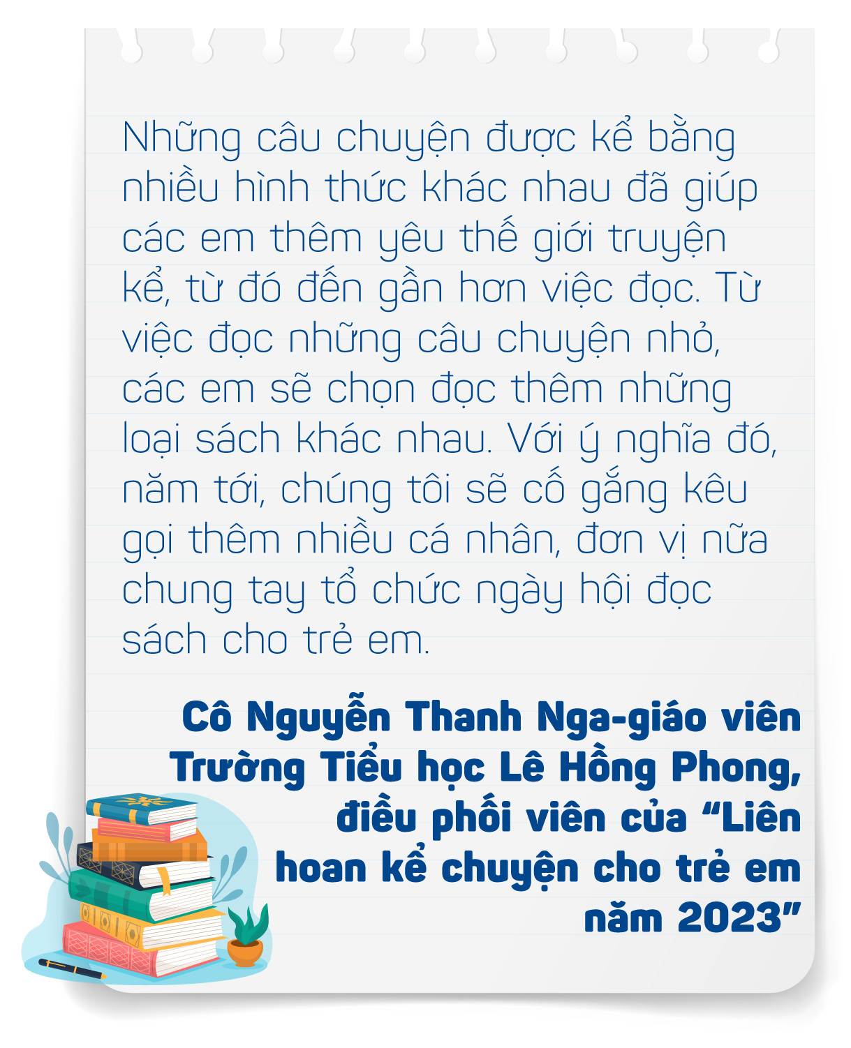 Còn cô Trần Thị Kim Tuyến-Hiệu trưởng nhà trường thì thông tin: “Từ khi biết trường sẽ tổ chức hoạt động này, em nào cũng phấn khởi, mong muốn chọn những câu chuyện hay để giới thiệu đến ngày hội. Đây là hoạt động thiết thực, góp phần lan tỏa văn hóa đọc trong học sinh”.