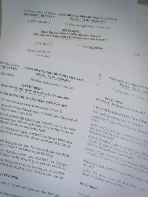 Theo đó, trong nội dung Công văn số 48/SNV-CCVC ngày 28/8/2018 của Giám đốc Sở Nội vụ tỉnh Quảng Ngãi về việc xử lý những sai phạm trong công tác tuyển dụng giáo viên tại huyện Trà Bồng cũng nêu ra những sai phạm, khuyết điểm của HĐTT như: Quyết định kiện toàn HĐTT vi phạm quy chế thi, cụ thể là giao ông Đỗ Văn Tín, chuyên viên Văn phòng HĐND - UBND huyện Trà Bồng làm Ủy viên Thư ký Hội đồng thi; thành lập Ban Đề thi, Ban Coi thi không đúng quy định, vi phạm quy chế thi.