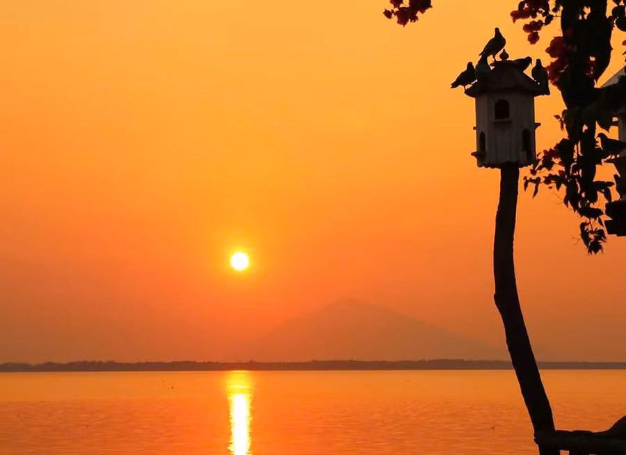 Bầu trời và hồ nước lúc này nhuộm sắc vàng, chỉ phân cách nhau bằng dải đất xám mờ. Không gian tĩnh lặng có lúc bị khuấy động với đàn chim chao lượn gọi nhau hoặc chiếc xuồng máy băng ngang qua lòng hồ.