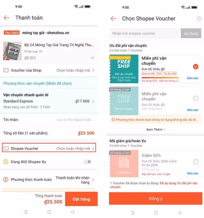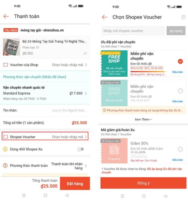 • Chọn mã Freeship, mã Shopee xong bạn nhấn vào nút Đồng ý để mã được áp dụng.
