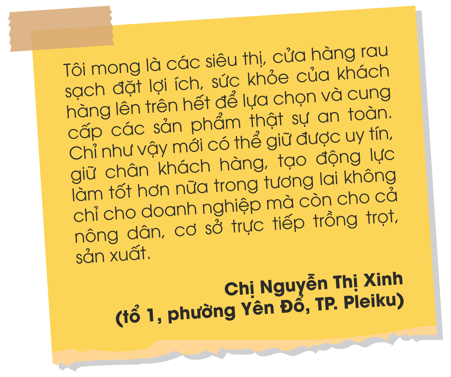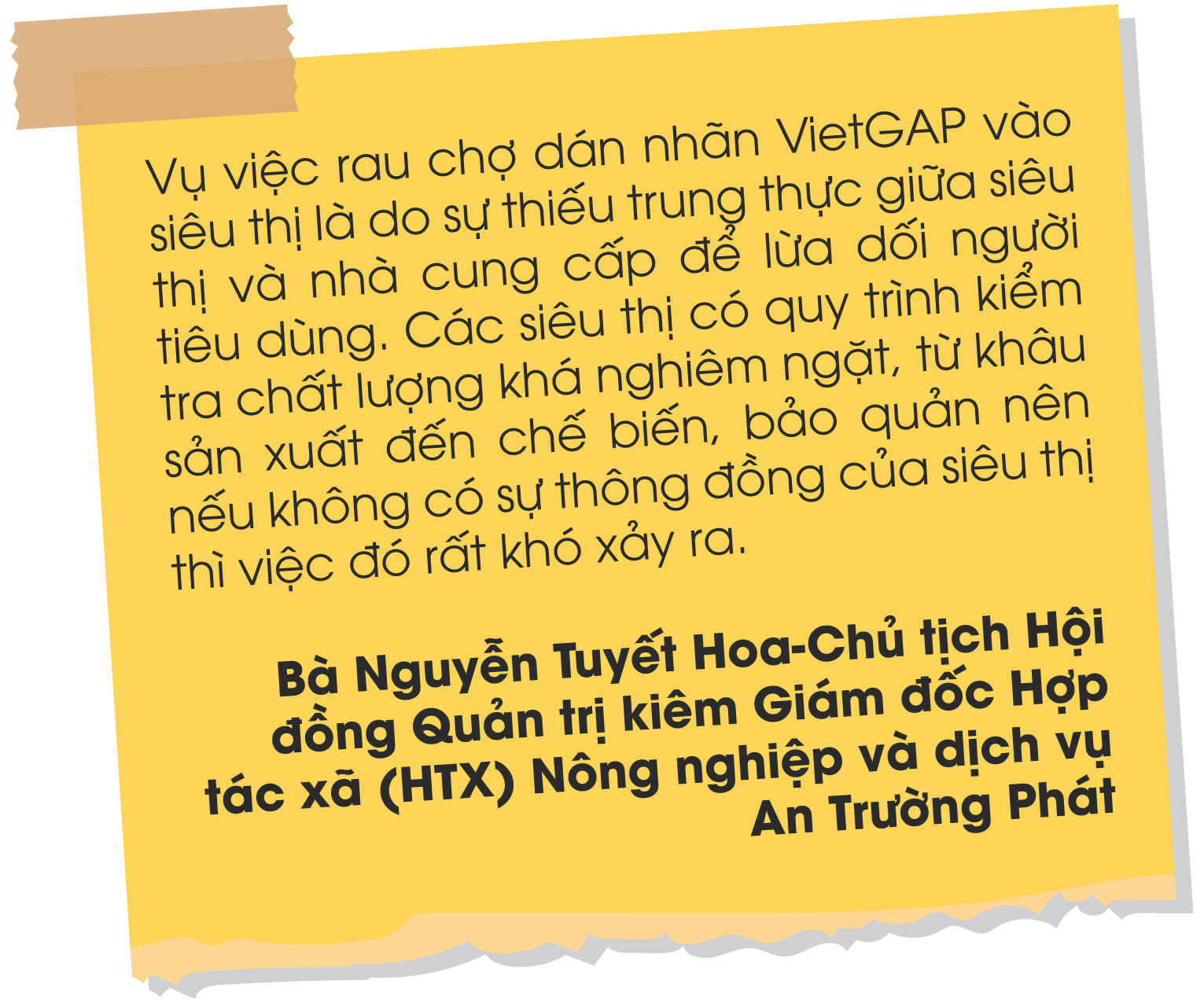 Hợp tác xã (HTX) Nông nghiệp và dịch vụ An Trường Phát là đơn vị tiên phong tại huyện Đak Pơ đứng ra liên kết với người dân sản xuất rau an toàn cung ứng cho các tỉnh, thành trong cả nước, nhất là TP. Hồ Chí Minh. Ngay từ khi đứng ra thành lập HTX, bà Nguyễn Tuyết Hoa-Chủ tịch Hội đồng Quản trị kiêm Giám đốc HTX-xác định phải đặt sức khỏe người tiêu dùng lên hàng đầu. Do đó, HTX xây dựng và hình thành chuỗi liên kết sản xuất theo quy trình kỹ thuật chặt chẽ từ khâu chăm sóc, bón phân, thu hoạch, bảo quản. Đặc biệt, HTX tuyệt đối không sử dụng các loại thuốc bảo vệ thực vật nằm trong danh mục cấm mà ưu tiên dùng thuốc trừ sâu sinh học, có tem truy xuất nguồn gốc rõ ràng, minh bạch. Vì vậy, dù chịu tác động xấu từ thông tin rau chợ dán nhãn VietGAP vào siêu thị ở TP. Hồ Chí Minh (thị trường chủ yếu của HTX) nhưng sản phẩm rau của HTX vẫn không có đủ để cung ứng cho thị trường.