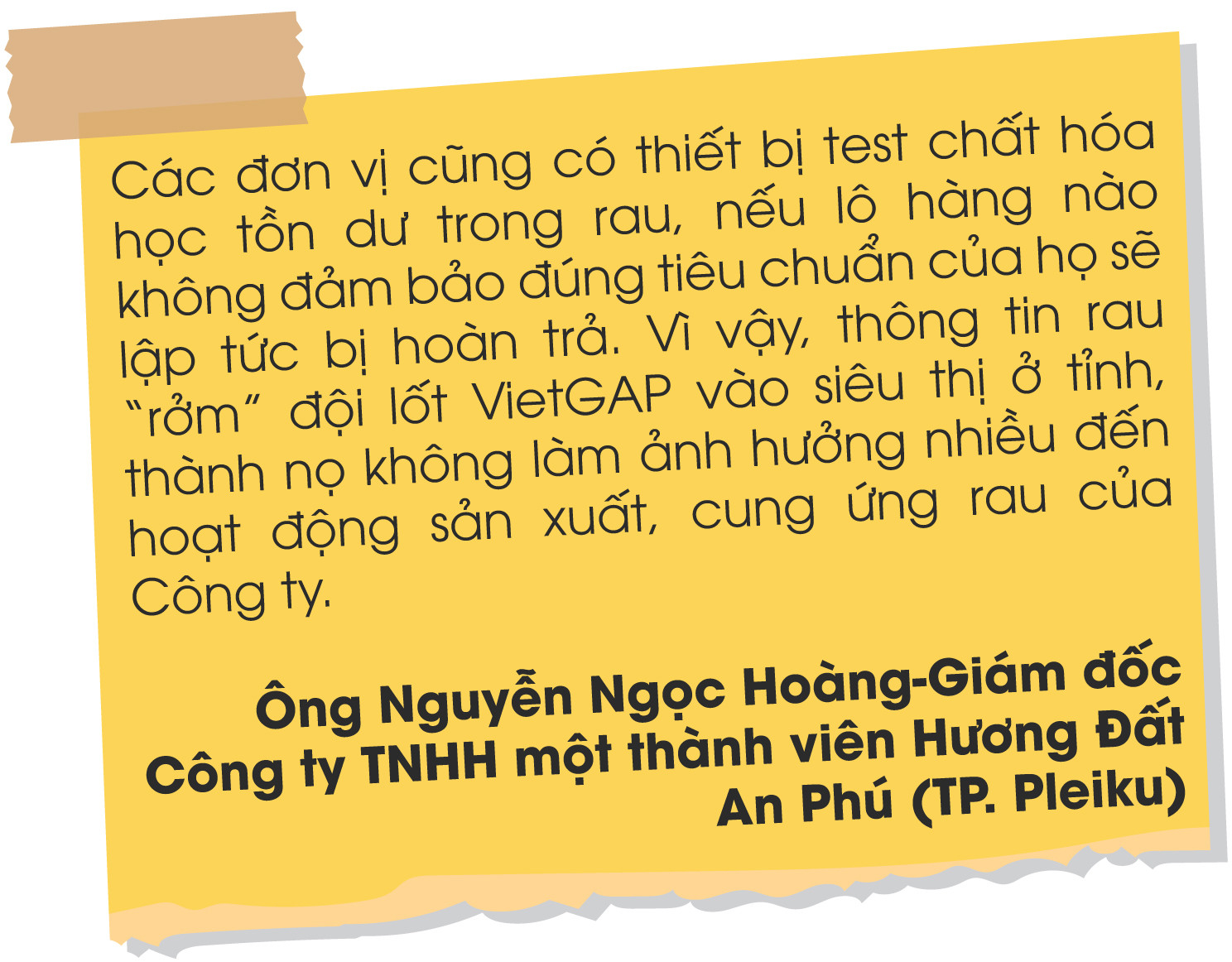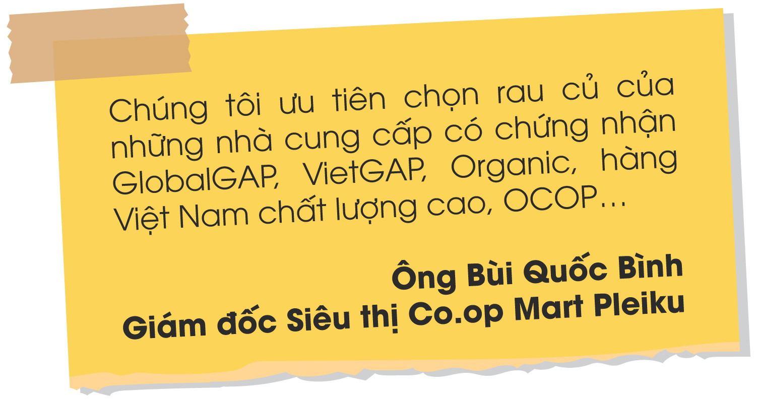 Còn ông Bùi Quốc Bình-Giám đốc Siêu thị Co.op Mart Pleiku cũng khẳng định: Các mặt hàng thực phẩm nói chung và rau củ nói riêng đều được đơn vị kiểm soát chặt chẽ ở các khâu trước khi đến tay người tiêu dùng. Do đó, thông tin rau chợ dán nhãn VietGAP vào siêu thị ở TP. Hồ Chí Minh mà báo chí nêu không ảnh hưởng đến đơn vị, hoạt động kinh doanh của Co.op Mart Pleiku vẫn rất tốt.