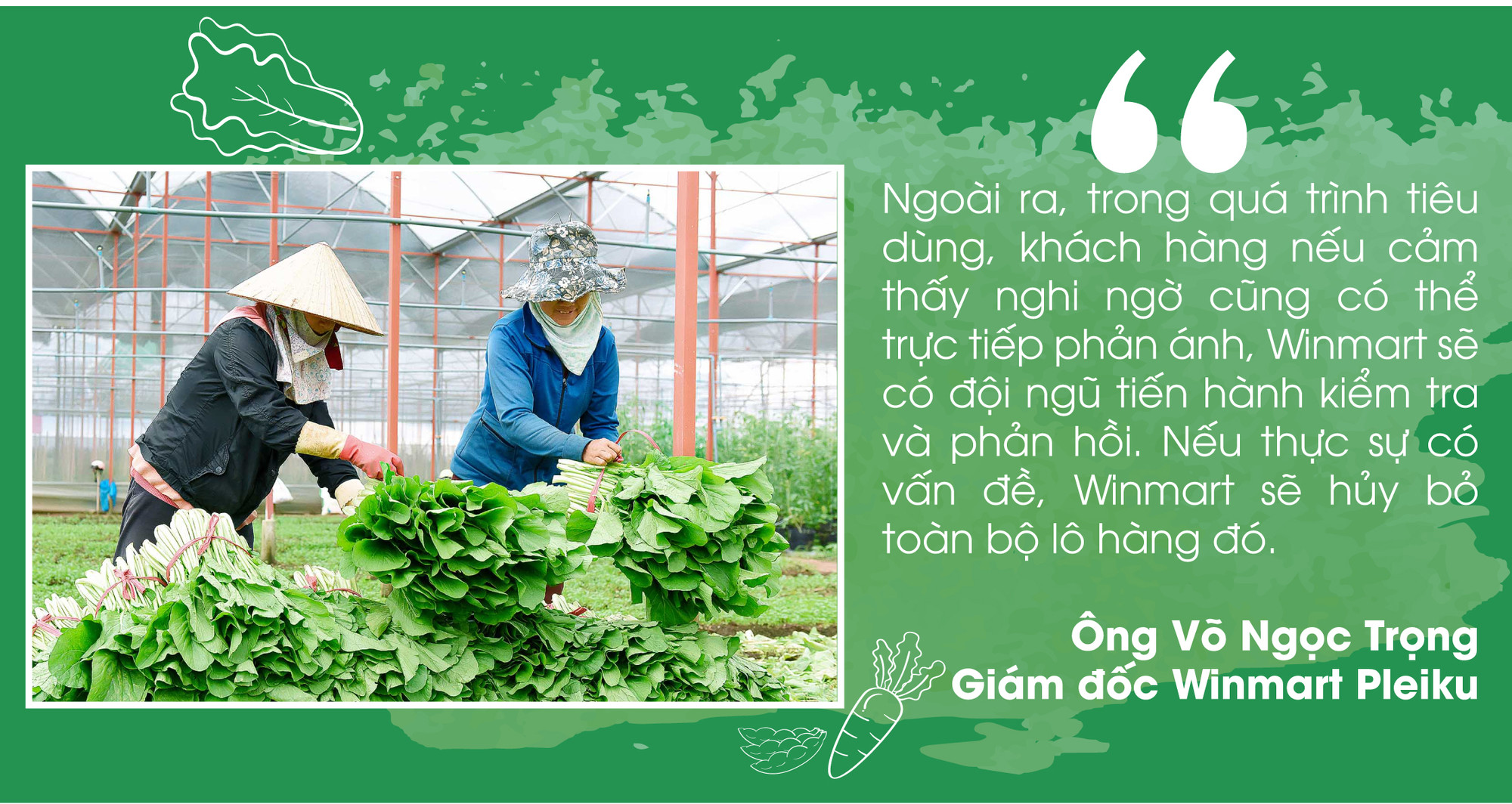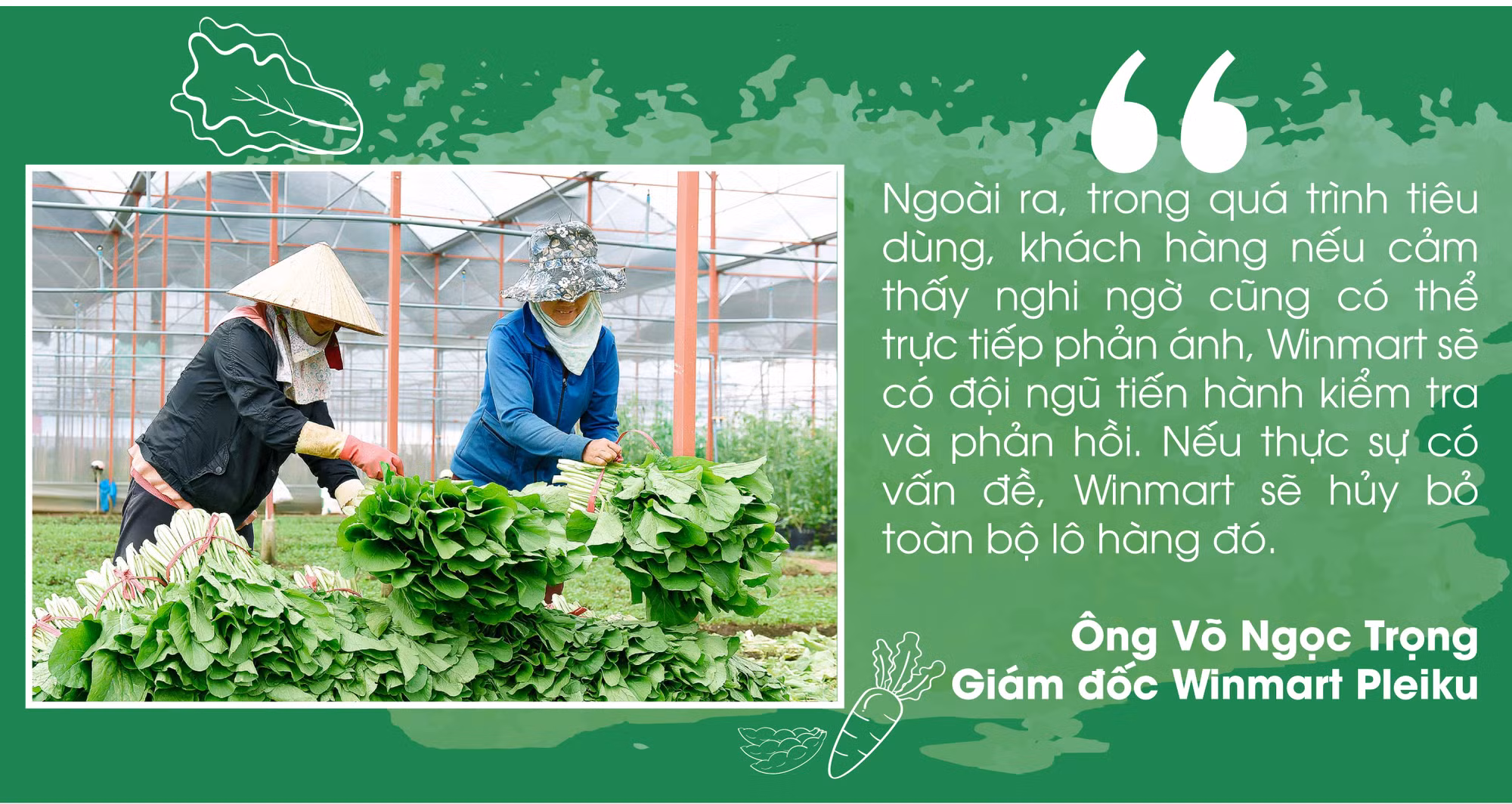 “Winmart tự tin cung cấp đến khách hàng các sản phẩm rau xanh đảm bảo sạch, an toàn bởi phần lớn rau được trồng và cung ứng bởi Công ty cổ phần WinEco Việt Nam. Ngay từ khi thành lập, WinEco sớm áp dụng công nghệ kỹ thuật tiên tiến để cung cấp rau củ quả sạch cho thị trường theo chuẩn hữu cơ, VietGAP, GlobalGAP trên quy mô lớn. Thương hiệu này chọn 3 đối tác Netafim (Israel), Kubota (Nhật Bản) và Teshuva Agricultural Projects-TAP (Israel) để nhập khẩu công nghệ sản xuất nông sản sạch với tổng trị giá trên 1.000 tỷ đồng. Hiện nay, WinEco là nhà phân phối độc quyền cho gần 3.000 siêu thị Winmart+, Winmart trên toàn quốc, trong đó có Winmart Pleiku”-ông Trọng nói.