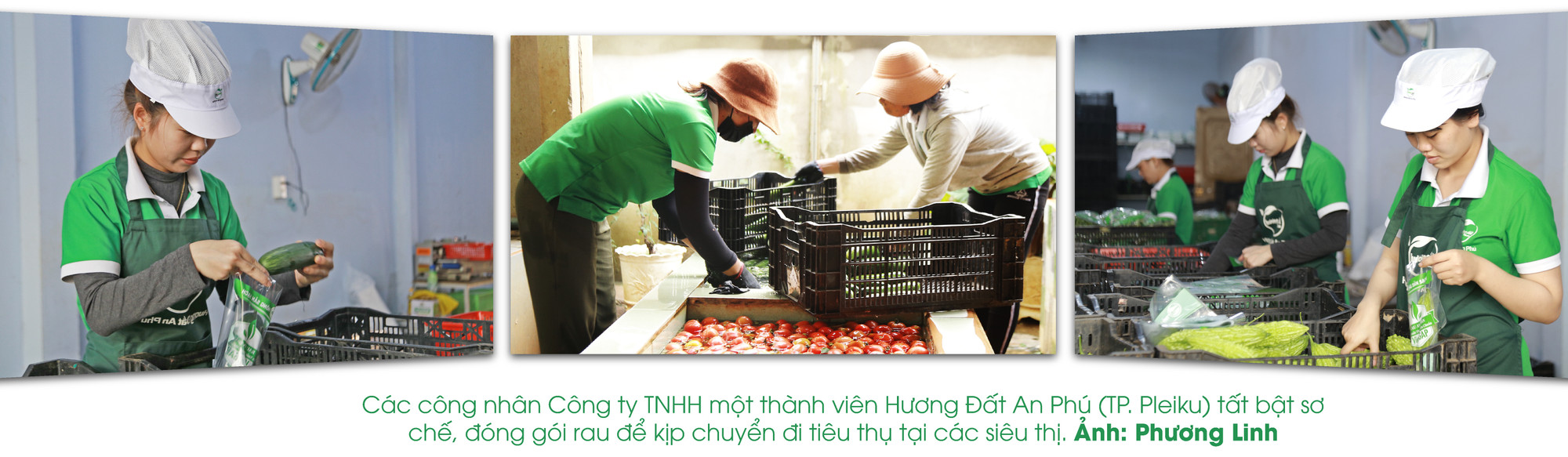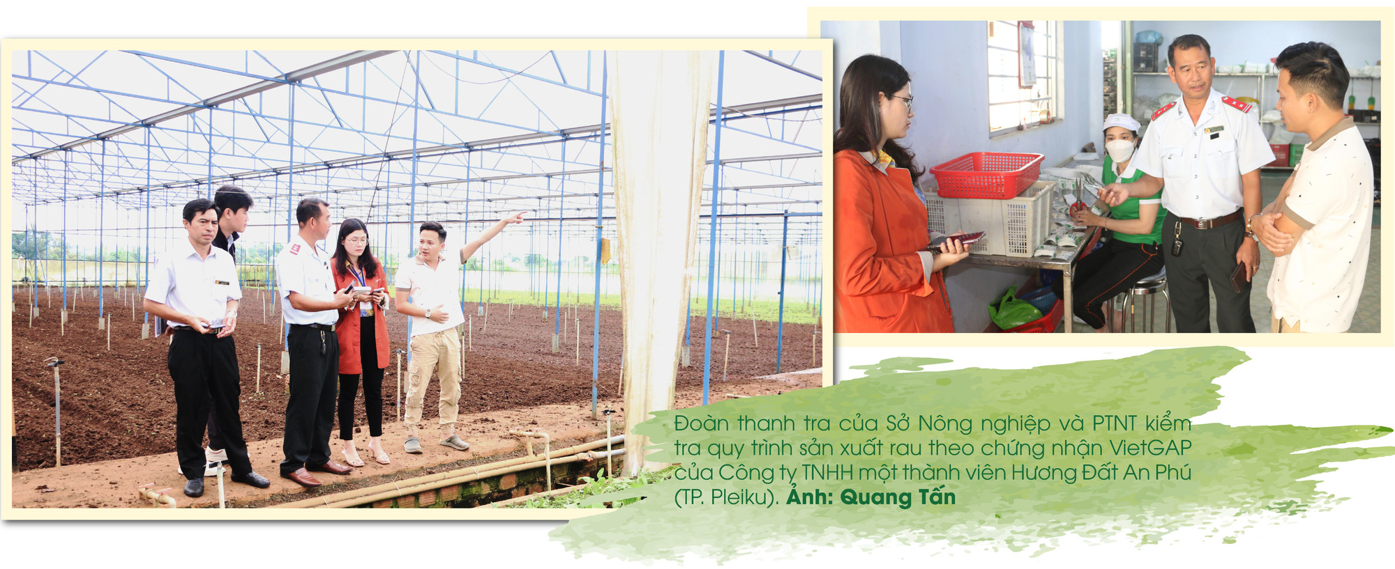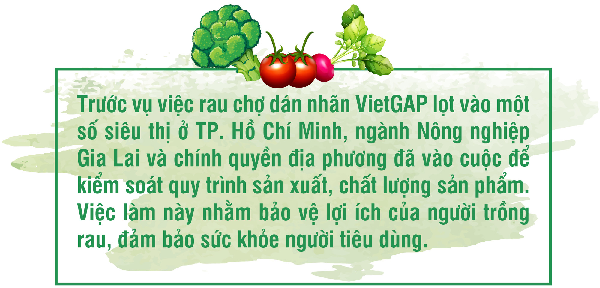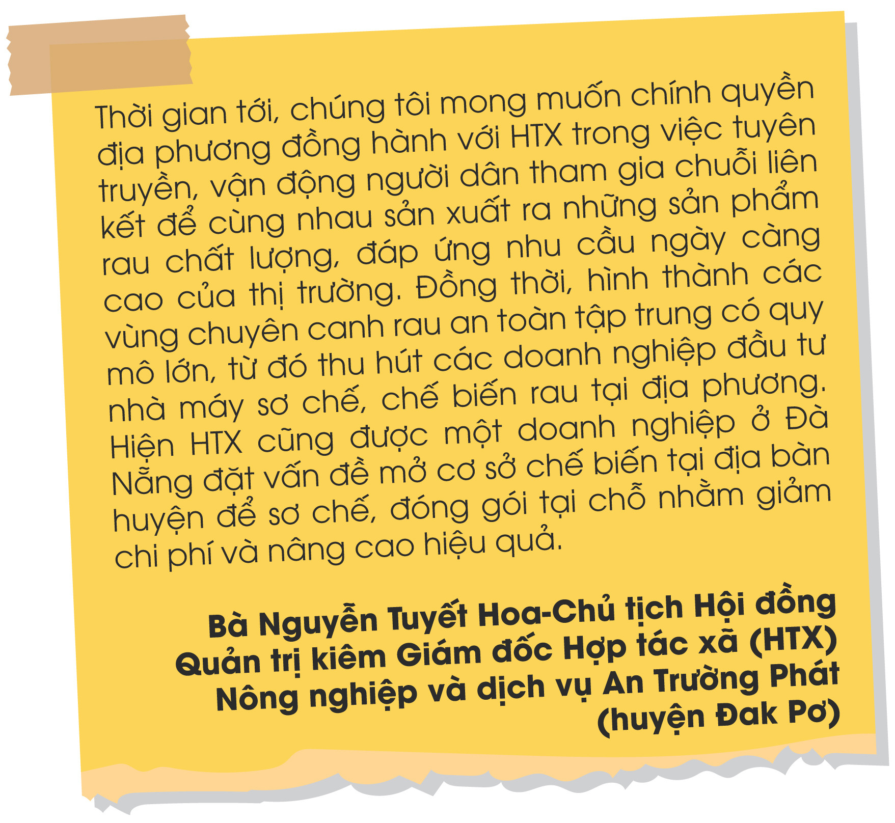 Để bảo vệ lợi ích của người sản xuất cũng như sức khỏe người tiêu dùng, Hợp tác xã (HTX) Nông nghiệp và dịch vụ An Trường Phát (huyện Đak Pơ) cũng tăng cường kiểm soát chặt chuỗi liên kết sản xuất của mình. Theo bà Nguyễn Tuyết Hoa-Chủ tịch Hội đồng Quản trị kiêm Giám đốc HTX, lúc cao điểm, mỗi ngày, HTX cung cấp cho thị trường Đà Nẵng và TP. Hồ Chí Minh gần 30 tấn rau củ các loại. Để đáp ứng nhu cầu, HTX đã liên kết với gần 200 hộ dân sản xuất hơn 50 ha rau củ các loại theo tiêu chuẩn VietGAP. Bên cạnh phối hợp với chính quyền địa phương tổ chức các lớp tập huấn, hướng dẫn quy trình sản xuất theo hướng VietGAP, HTX cũng làm mô hình điểm hơn 1,2 ha rau củ các loại để cầm tay chỉ việc cho người dân tại vườn. Ngoài ra, để kiểm soát tốt quy trình sản xuất, các thành viên trong tổ liên kết đều có nhật ký ghi chép quá trình sản xuất và tiến hành giám sát chéo lẫn nhau trong tổ và giữa các tổ, nếu tổ liên kết nào vi phạm thì sẽ bị loại bỏ khỏi chuỗi liên kết. Chính vì vậy, ý thức trách nhiệm của người dân khi tham gia chuỗi liên kết được nâng lên, qua đó tạo ra các sản phẩm rau củ đảm bảo an toàn vệ sinh thực phẩm.