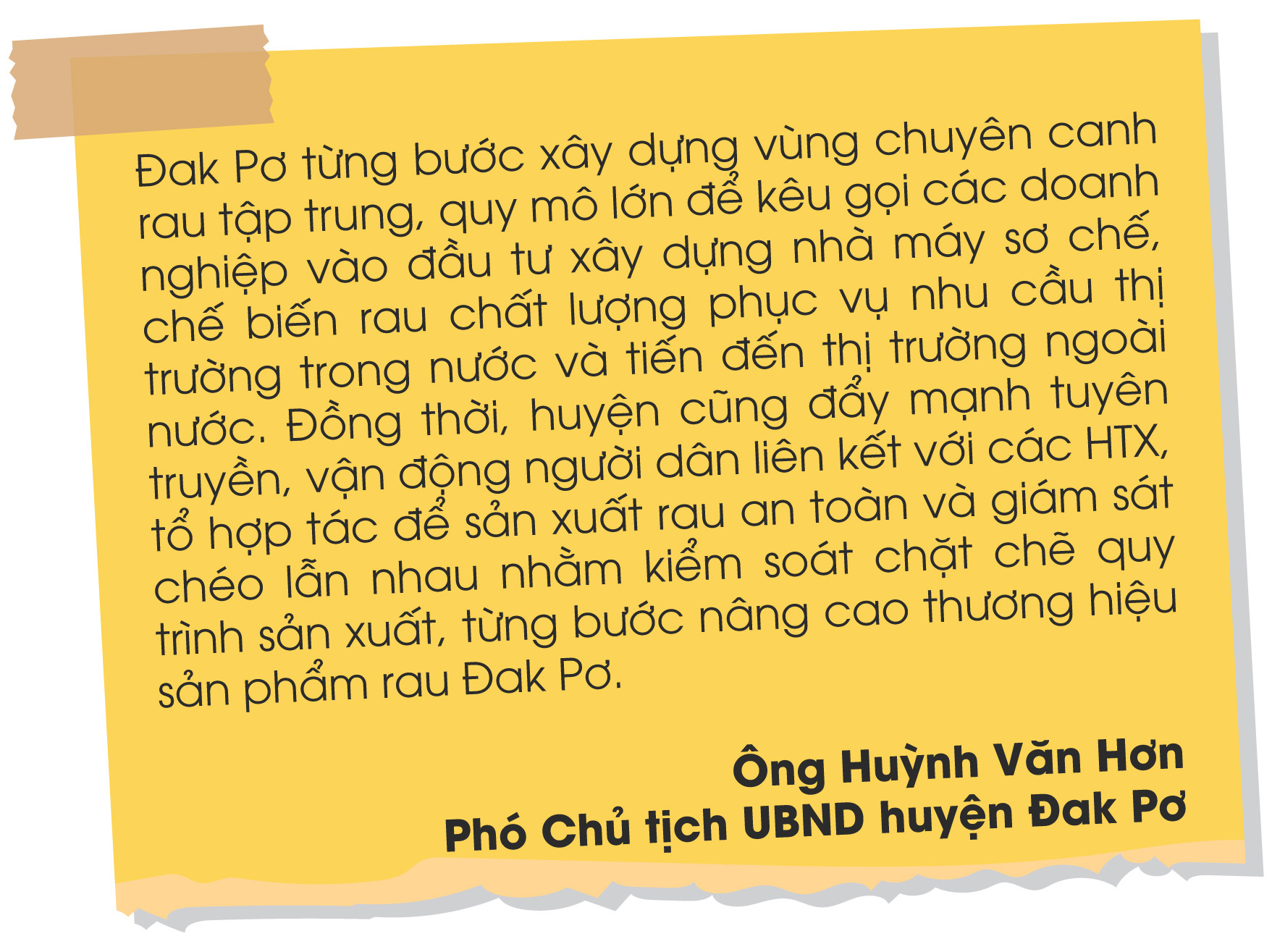 Ông Huỳnh Văn Hơn-Phó Chủ tịch UBND huyện Đak Pơ-cho biết: Sau khi được chứng nhận nhãn hiệu “Rau Đak Pơ”, huyện đang tập trung quy hoạch vùng chuyên canh rau an toàn bền vững theo các tiêu chuẩn như VietGAP, GlobalGAP… để nâng cao chất lượng sản phẩm. Đồng thời, huyện đẩy mạnh ứng dụng tiến bộ khoa học kỹ thuật, đưa cơ giới vào sản xuất nhằm giảm chi phí, tăng lợi nhuận trên cùng đơn vị diện tích, tạo đầu ra ổn định cho cây rau. Đặc biệt, mới đây, UBND huyện đã trình Ban Thường vụ Huyện ủy thông qua chủ trương thực hiện Dự án “Quản lý và phát triển nhãn hiệu chứng nhận gắn với tiêu thụ sản phẩm rau Đak Pơ, tỉnh Gia Lai” với tổng kinh phí gần 650 triệu đồng. Theo đó, để quản lý và khai thác hiệu quả nhãn hiệu chứng nhận “Rau Đak Pơ”, huyện sẽ tổ chức tập huấn, hướng dẫn người dân, doanh nghiệp, hợp tác xã sử dụng nhãn hiệu chứng nhận trong hoạt động sản xuất kinh doanh; triển khai điểm các mô hình sản xuất rau an toàn theo các tiêu chuẩn như: VietGAP, GlobalGAP, hữu cơ… để hướng dẫn, nhân rộng trong người dân.
