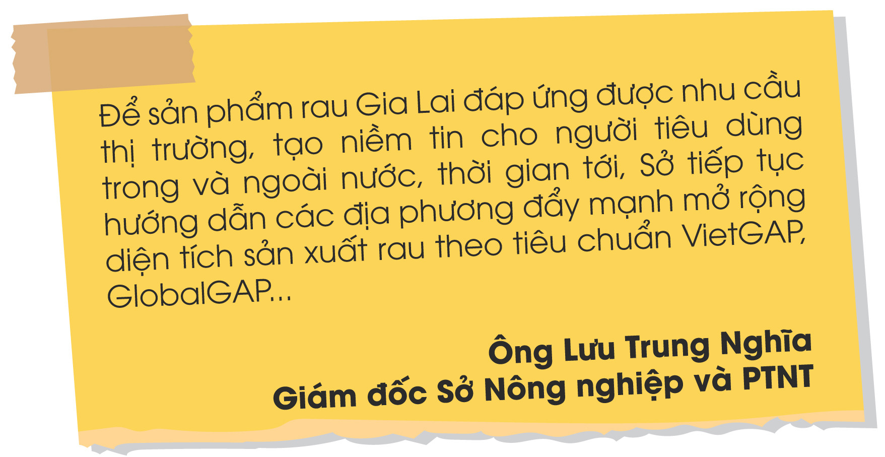 Trao đổi với P.V, ông Lưu Trung Nghĩa-Giám đốc Sở Nông nghiệp và PTNT-cho hay: Những năm gần đây, ngành rau, hoa, quả Gia Lai đang từng bước trở thành một trong những ngành hàng chủ lực của tỉnh khi tỷ trọng sản xuất tăng mạnh qua từng năm. Các sản phẩm rau quả của Gia Lai đã có mặt ở nhiều thị trường trong và ngoài nước. Để phát triển bền vững ngành rau, hoa, quả, UBND tỉnh đã ban hành Đề án phát triển sản xuất rau, hoa và cây ăn quả đến năm 2030, định hướng đến năm 2040. Theo đó, định hướng phát triển sản xuất rau của tỉnh đến năm 2025 sẽ mở rộng diện tích lên 20.000 ha, đến năm 2030 tăng lên 30.000 ha và giữ ổn định đến năm 2040. Trong đó, hình thành các chuỗi liên kết sản xuất rau an toàn theo hướng hàng hóa, ứng dụng công nghệ cao vào sản xuất theo các tiêu chuẩn VietGAP, GlobalGAP, Organic… với diện tích khoảng trên 500 ha vào năm 2025 và 750 ha năm 2040; xây dựng vùng nguyên liệu cho nhà máy chế biến rau quả trong tỉnh với diện tích 5.000 ha năm 2025 và 10.000 ha năm 2040.