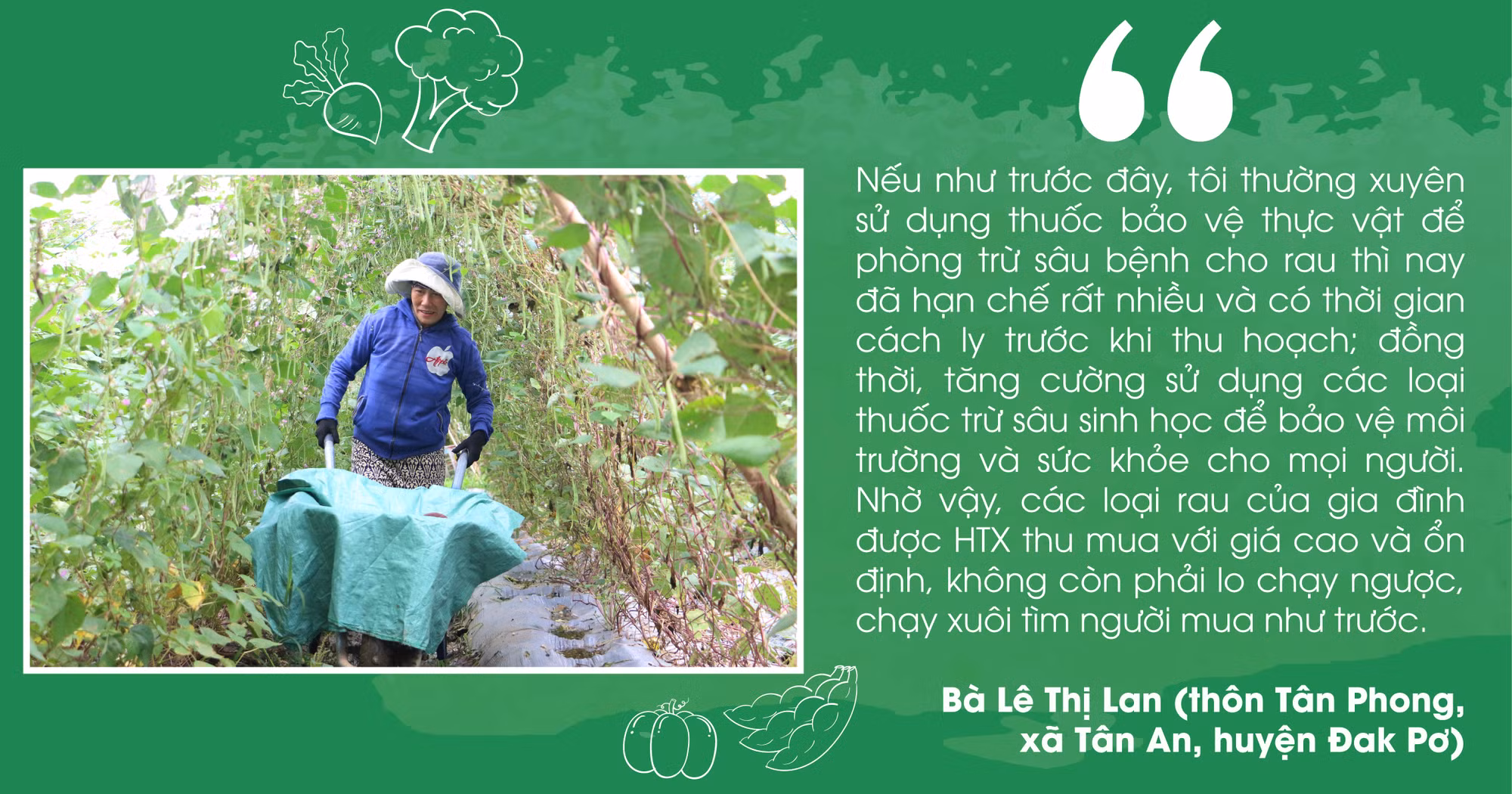 Gắn bó với nghề trồng rau mấy chục năm nay nên bà Lê Thị Lan (thôn Tân Phong, xã Tân An, huyện Đak Pơ) khá thấm thía với điệp khúc “được mùa mất giá, được giá mất mùa”. Thế nhưng, kể từ khi tham gia chuỗi liên kết sản xuất rau an toàn của HTX Nông nghiệp và dịch vụ An Trường Phát, cuộc sống gia đình bà ngày càng ổn định hơn. Bà Lan phấn khởi cho biết: “Hơn 4 năm tham gia chuỗi liên kết sản xuất rau theo tiêu chuẩn VietGAP, tôi đã ý thức và trách nhiệm hơn trong việc sản xuất rau theo hướng an toàn để bảo vệ sức khỏe bản thân, gia đình và cả người tiêu dùng”.