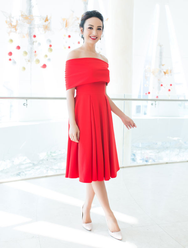 Trong không khí chuẩn bị chào đón Giáng sinh và mừng năm mới, sắc đỏ ấm áp thường được sử dụng để mang đến hình ảnh hài hoà cùng mùa tiệc tùng. Với tông màu thời thượng, các người đẹp Việt lại có nhiều lựa chọn khác nhau để thể hiện sự sành điệu. Hoa hậu VN 2016 Đỗ Mỹ Linh chọn váy lệch vai kiểu dáng cổ điển để khoe nét yêu kiều.