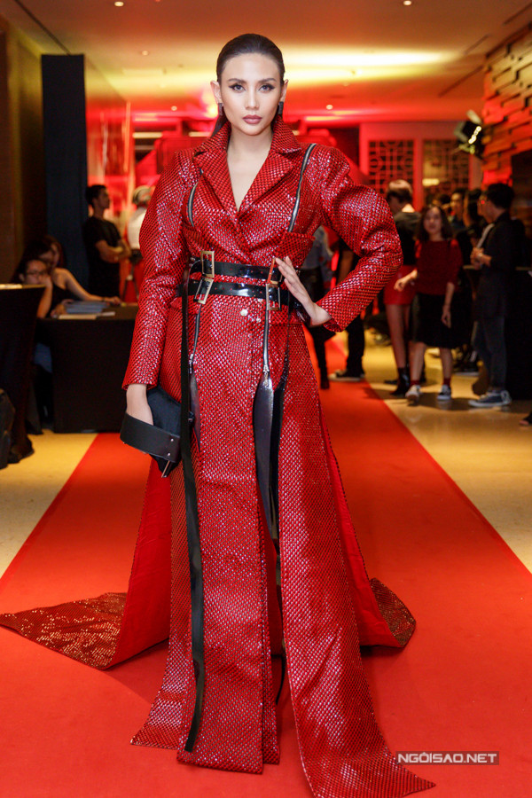 Siêu mẫu Võ Hoàng Yến giúp mình trở nên cá tính hơn với trang phục đỏ đen được tạo điểm nhấn phá cách cho áo cổ vest đi kèm xẻ tà.