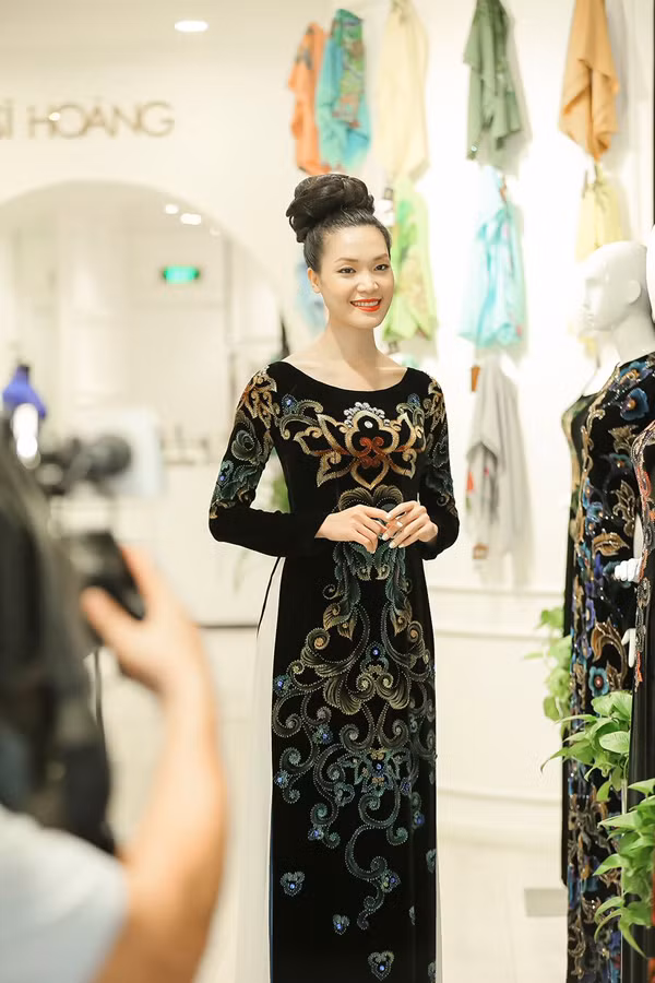 Yêu thích vẻ đẹp dịu dàng, nền nã của tà áo dài, Hoa hậu Thùy Dung lựa chọn mẫu thiết kế mang họa tiết kết đính công phu của nhà thiết kế Sĩ Hoàng. Kiểu búi tóc cao tôn thêm nét quý phái cho người đẹp.