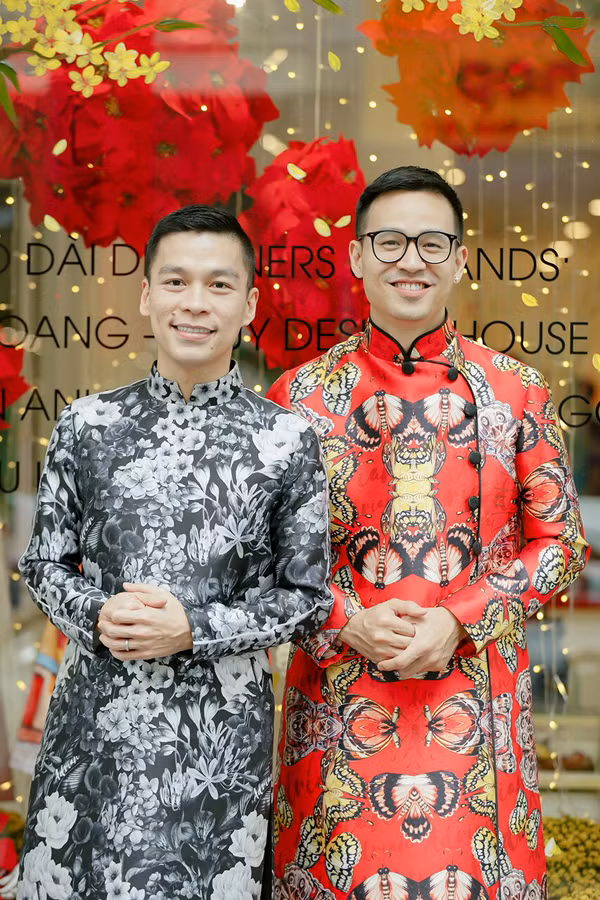 Nhà thiết kế Adrian Anh Tuấn tối giản với áo dài họa tiết hoa đơn sắc. Trong khi doanh nhân Sơn Đoàn nổi bật với thiết kế màu đỏ trong BST áo dài dành cho phái mạnh.