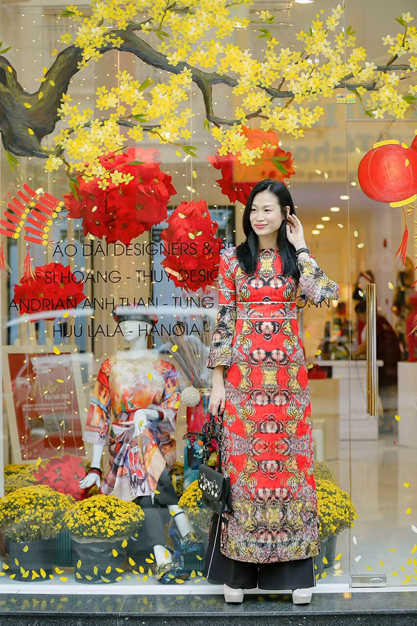 Fashionista Trương Thanh Trúc mới lạ trong tà áo dài của nhà thiết kế Adrian Anh Tuấn. Theo cô, lựa chọn áo dài xuống phố đầu năm sẽ giúp người mặc gặp nhiều may mắn và sự vui tươi.