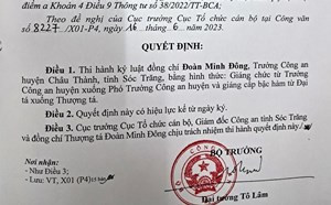 Tương tự, ngày 5.7, Công an tỉnh Sóc Trăng xác nhận, Bộ trưởng Bộ Công an đã có quyết định kỷ luật ông Đoàn Minh Đông (57 tuổi, Trưởng Công an huyện Châu Thành, tỉnh Sóc Trăng) bằng hình thức giáng chức từ Trưởng Công an huyện xuống Phó trưởng Công an huyện và giáng cấp bậc hàm từ Đại tá xuống Thượng tá.