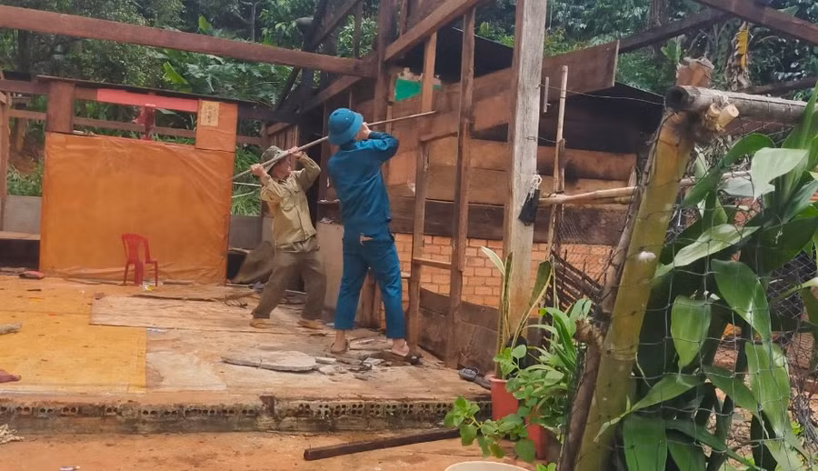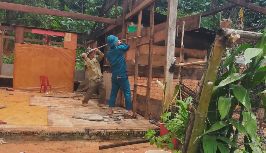 | Lực lượng dân quân hỗ trợ người dân tháo dỡ nhà. Ảnh: Phan Tuấn |