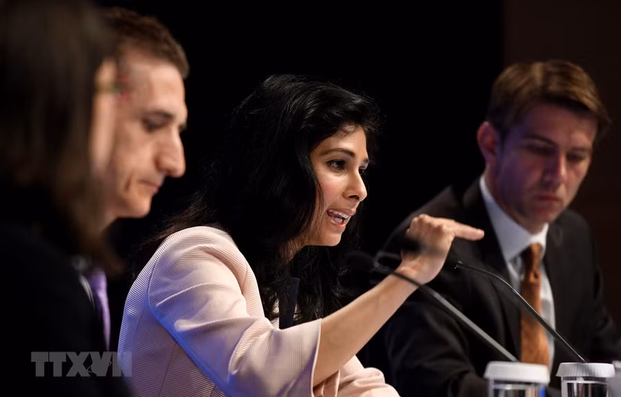 Nhà kinh tế trưởng của IMF, bà Gita Gopinath (giữa) phát biểu tại cuộc họp báo ở Washington, DC. (Ảnh: THX/TTXVN)