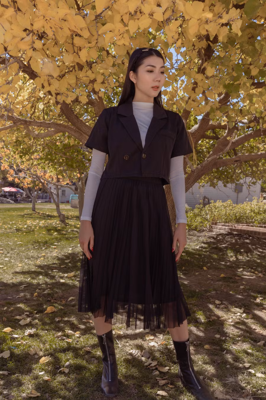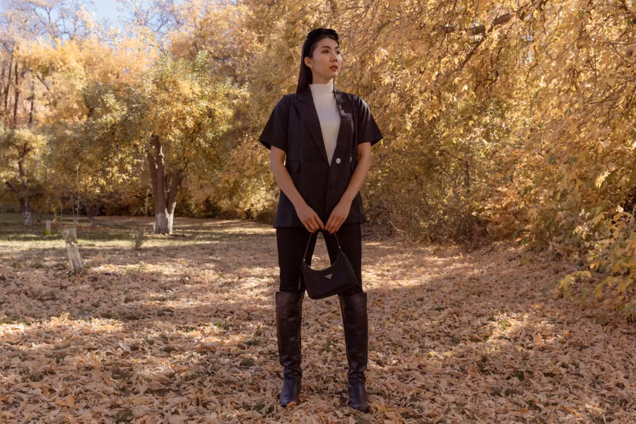 Trong bộ ảnh mới, Ngọc Quyên trình diễn cách phối đồ với những gam màu trầm như đen, nâu hay ngọt ngào như hồng, cam, tươi sáng như xanh da trời, trắng… trên nền lá thu vàng rực.