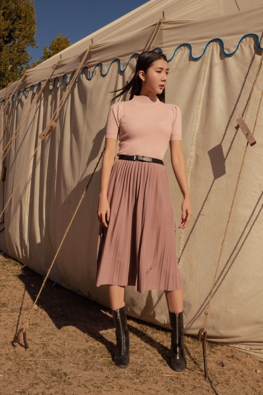 Bốn mùa trong năm, Ngọc Quyên đều thích mặc đầm midi bởi sự nữ tính mà nó mang lại. Các mẫu đầm midi cô chọn diện khi thu sang có màu đen, nude với chất liệu phối ren hay nhung lì. Item này dễ kết hợp với áo len mỏng, crop top… thêm đôi boots da cổ cao là hoàn thiện set đồ đầy phong cách.
